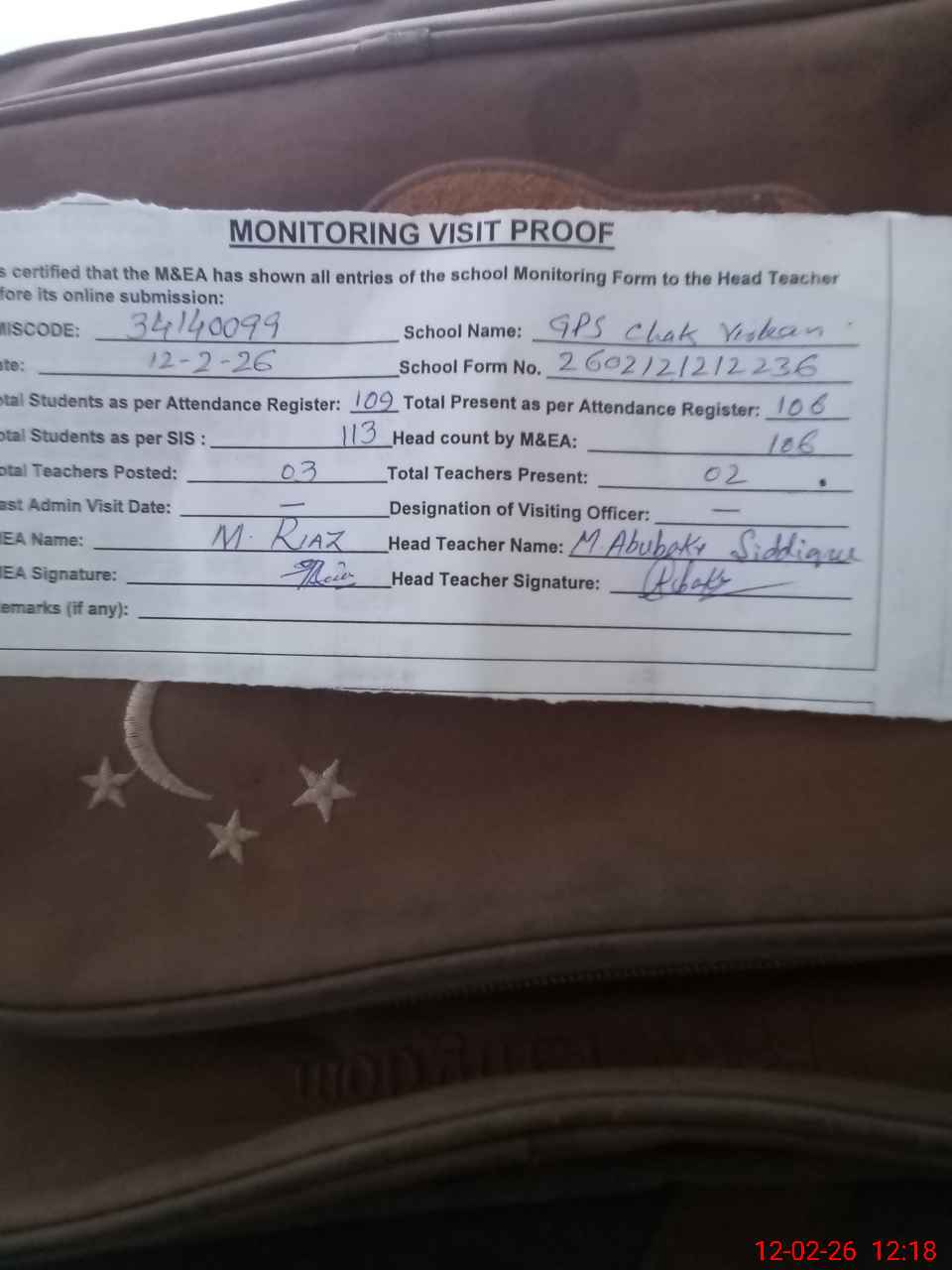 | Attendance Register | Head Teacher | MEA with School | Visit Proof |