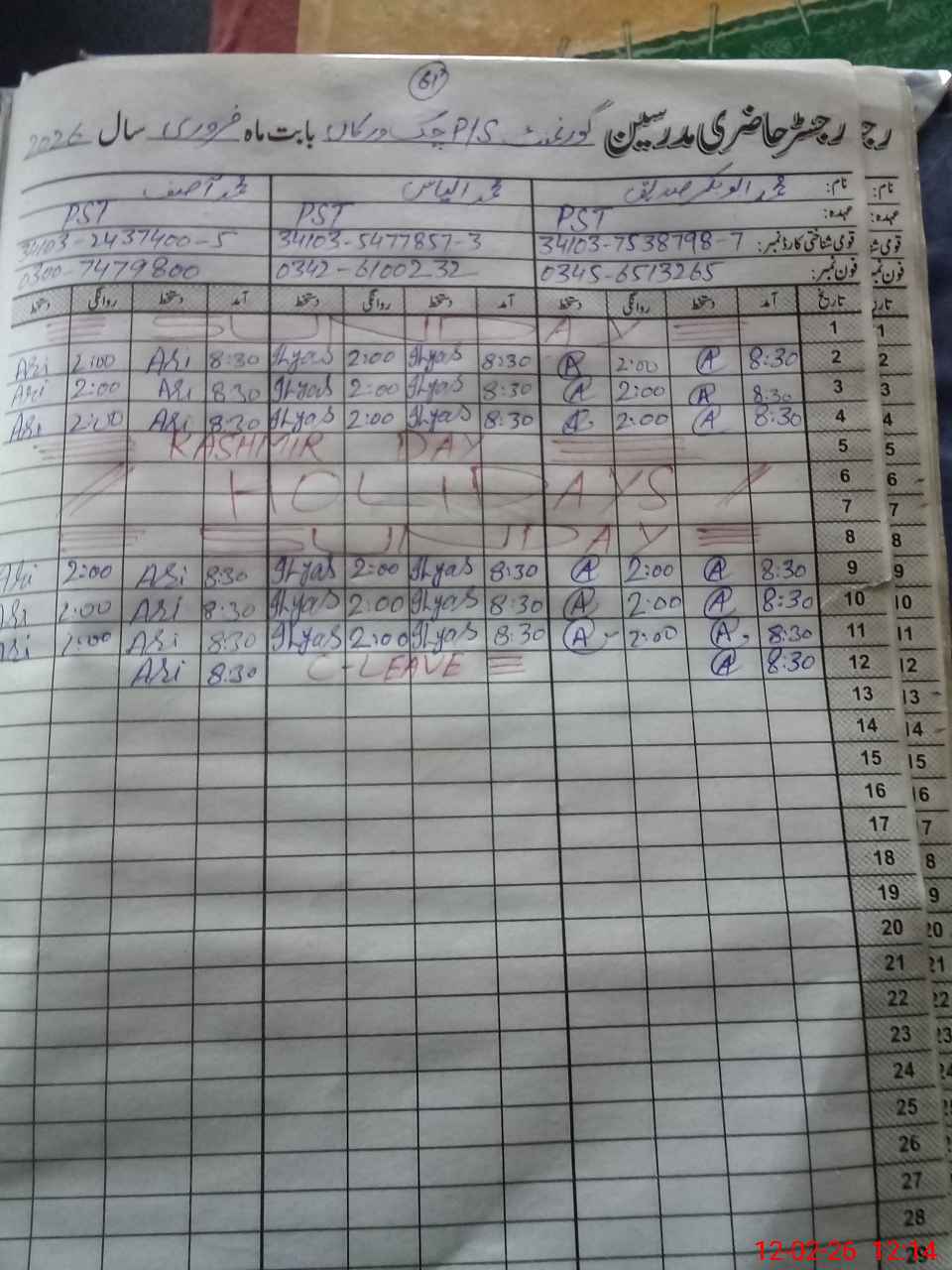 | CNIC | Full Name | Designation | R/C | Absence During Last Calender Month |