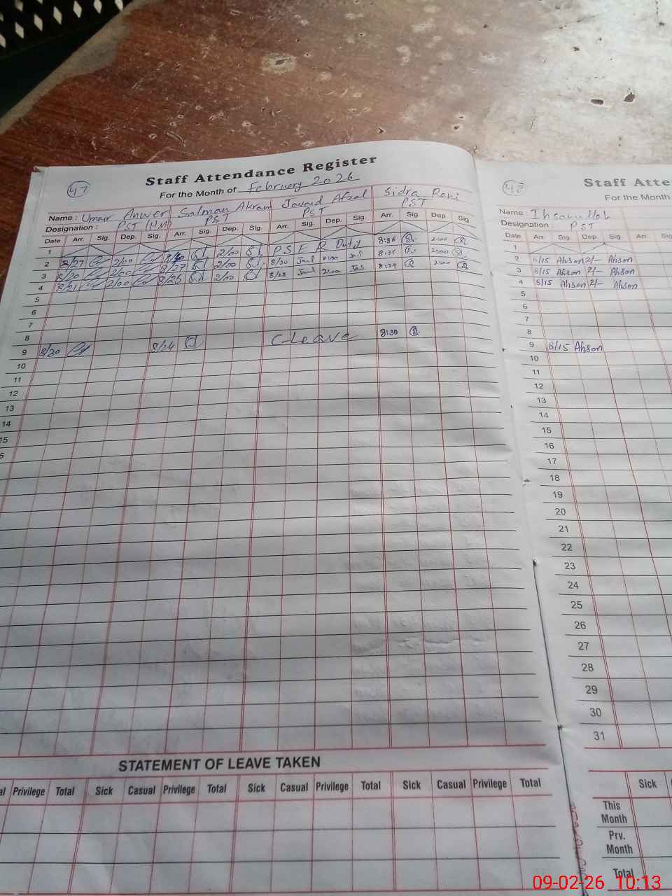 | CNIC | Full Name | Designation | R/C | Absence During Last Calender Month |