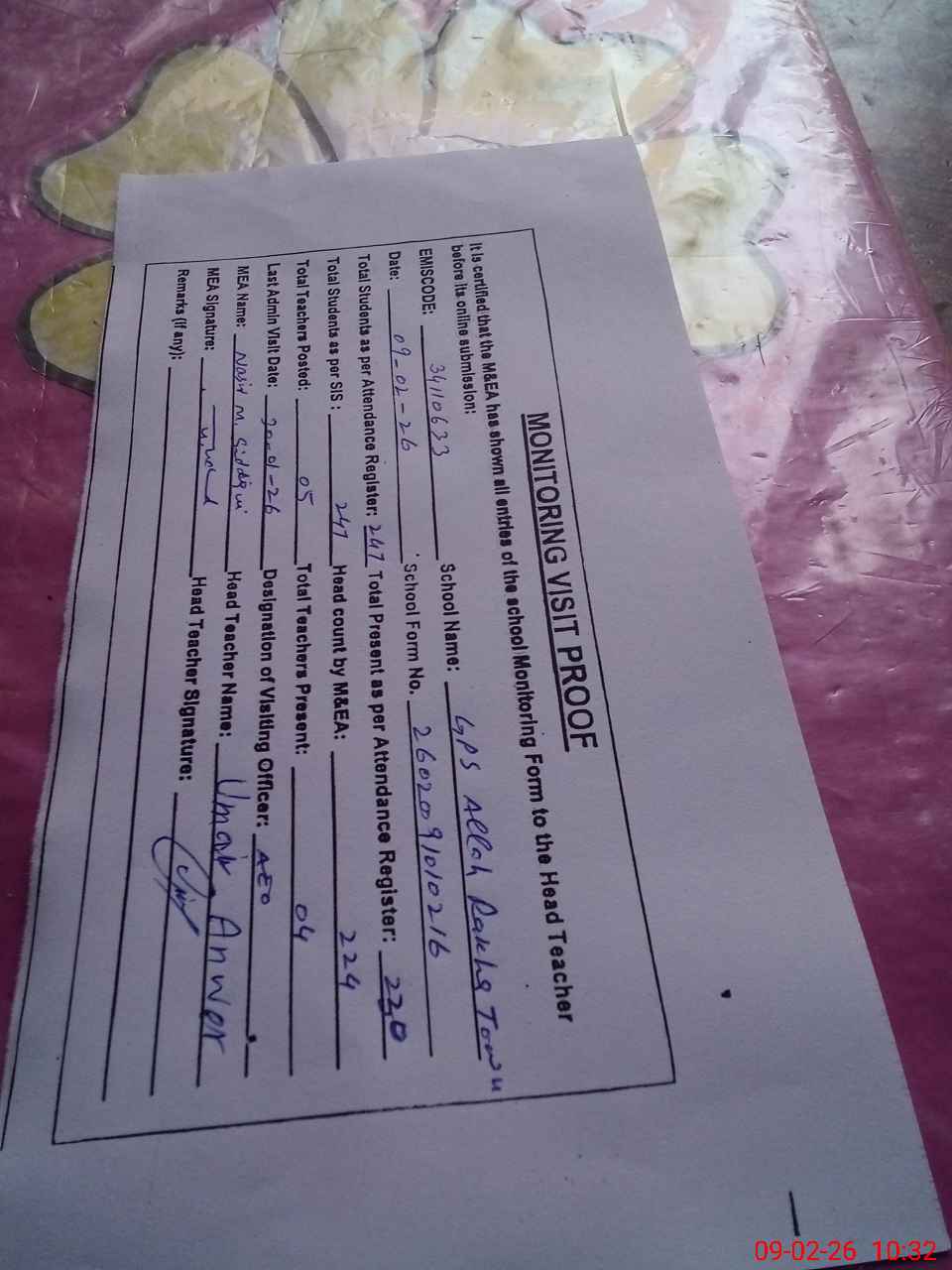 | Attendance Register | Head Teacher | MEA with School | Visit Proof |
