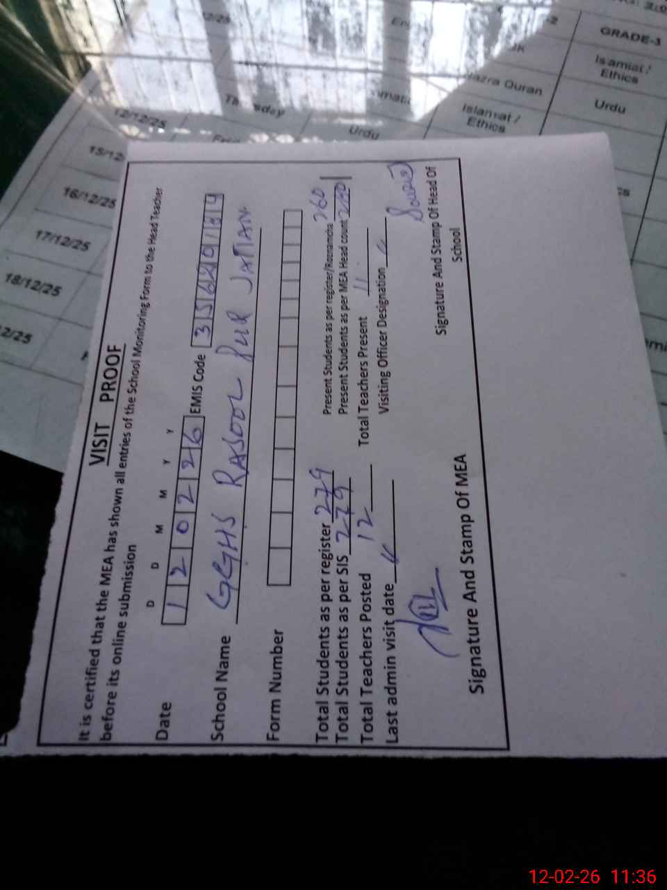 | EMIS Code: 35620184 | Name of School: GGHS RASUL PUR JATTAN | |||