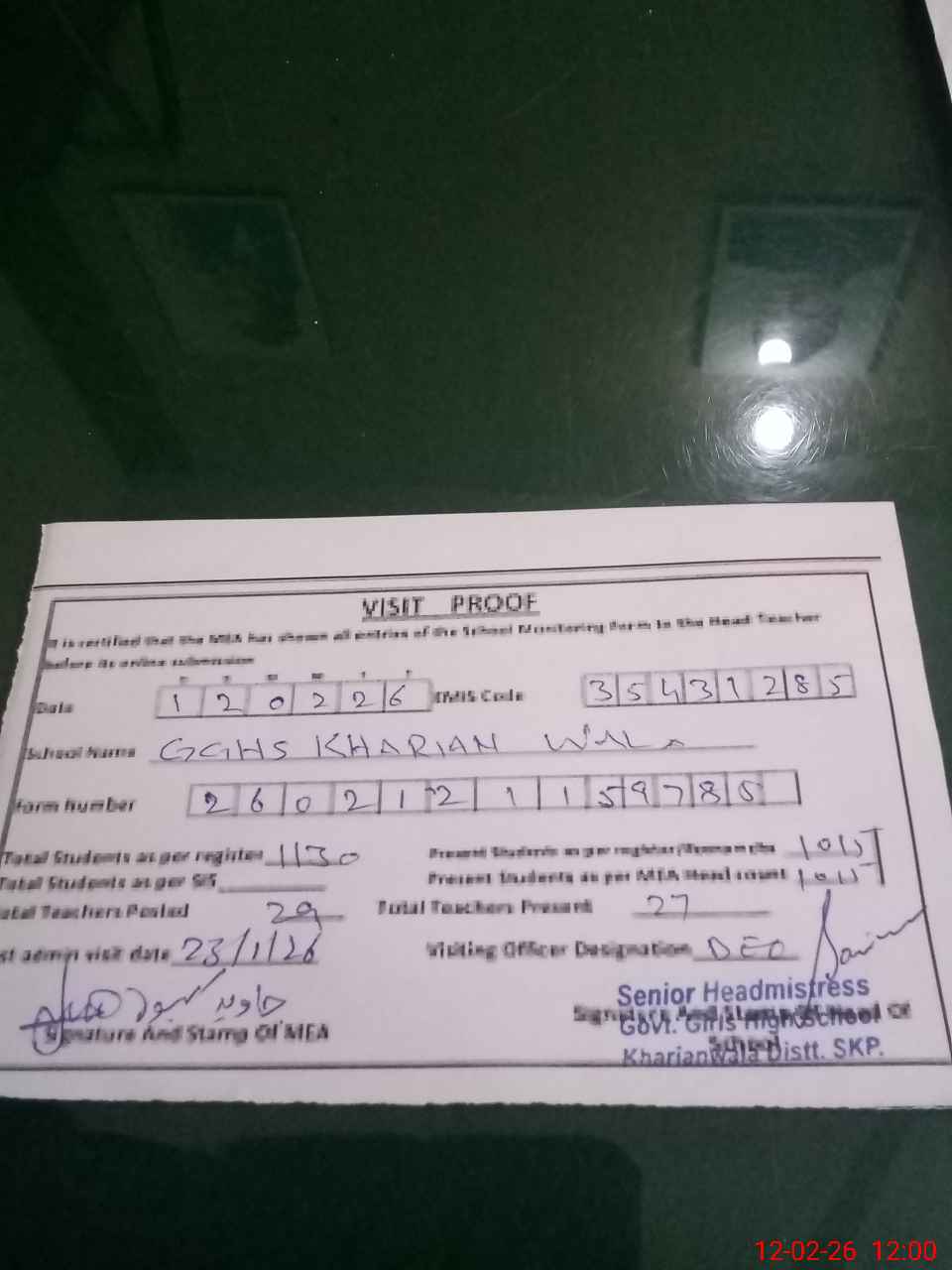 | Attendance Register | Head Teacher | MEA with School | Visit Proof |