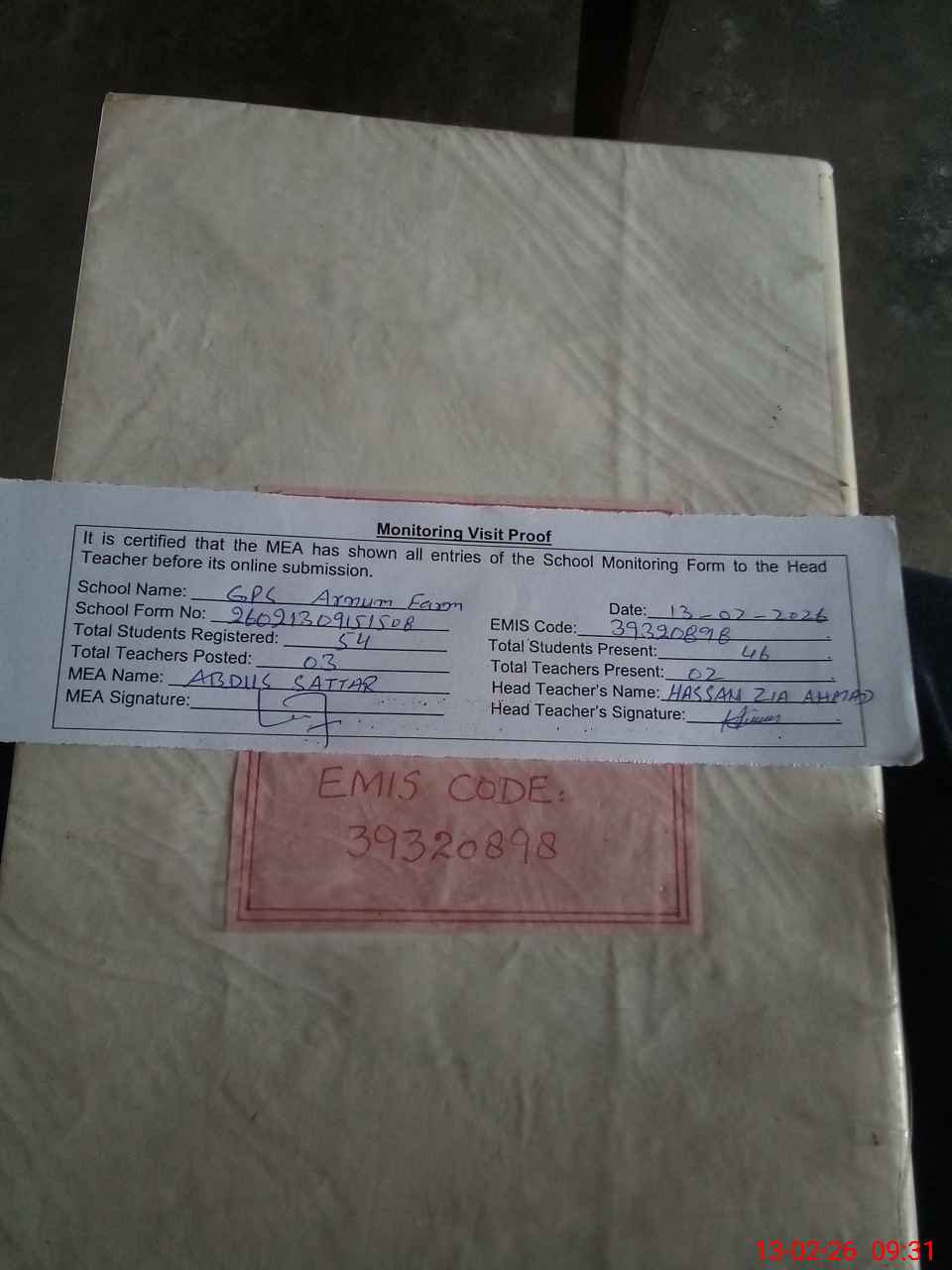 | Attendance Register | Head Teacher | MEA with School | Visit Proof |