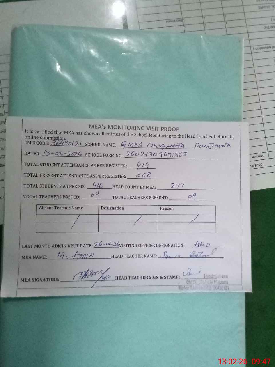 | Attendance Register | Head Teacher | MEA with School | Visit Proof |