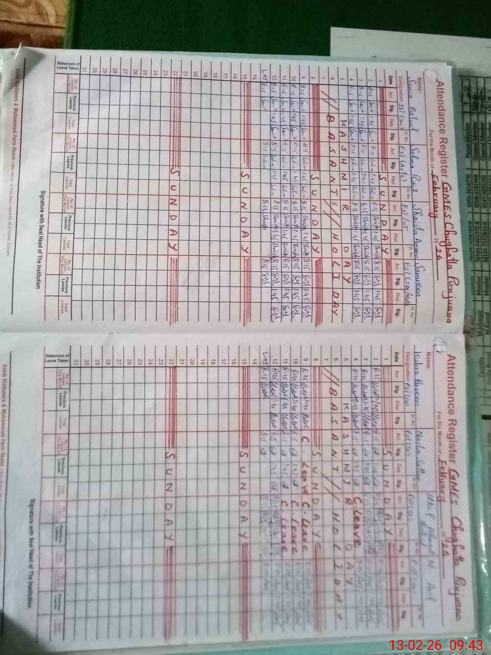 | CNIC | Full Name | Designation | R/C | Absence During Last Calender Month |