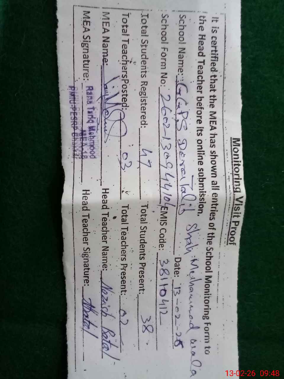 | Certified that this School was Inspected by the Undersigned MEA/DMO Today and the Information Stated Above is as Per Record. | |||||