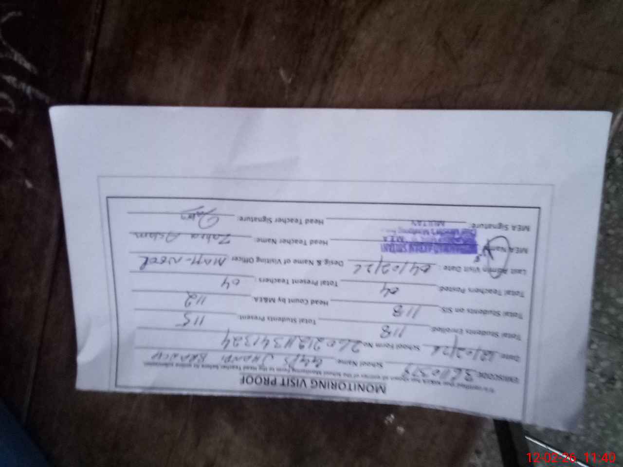 | Attendance Register | Head Teacher | MEA with School | Visit Proof |