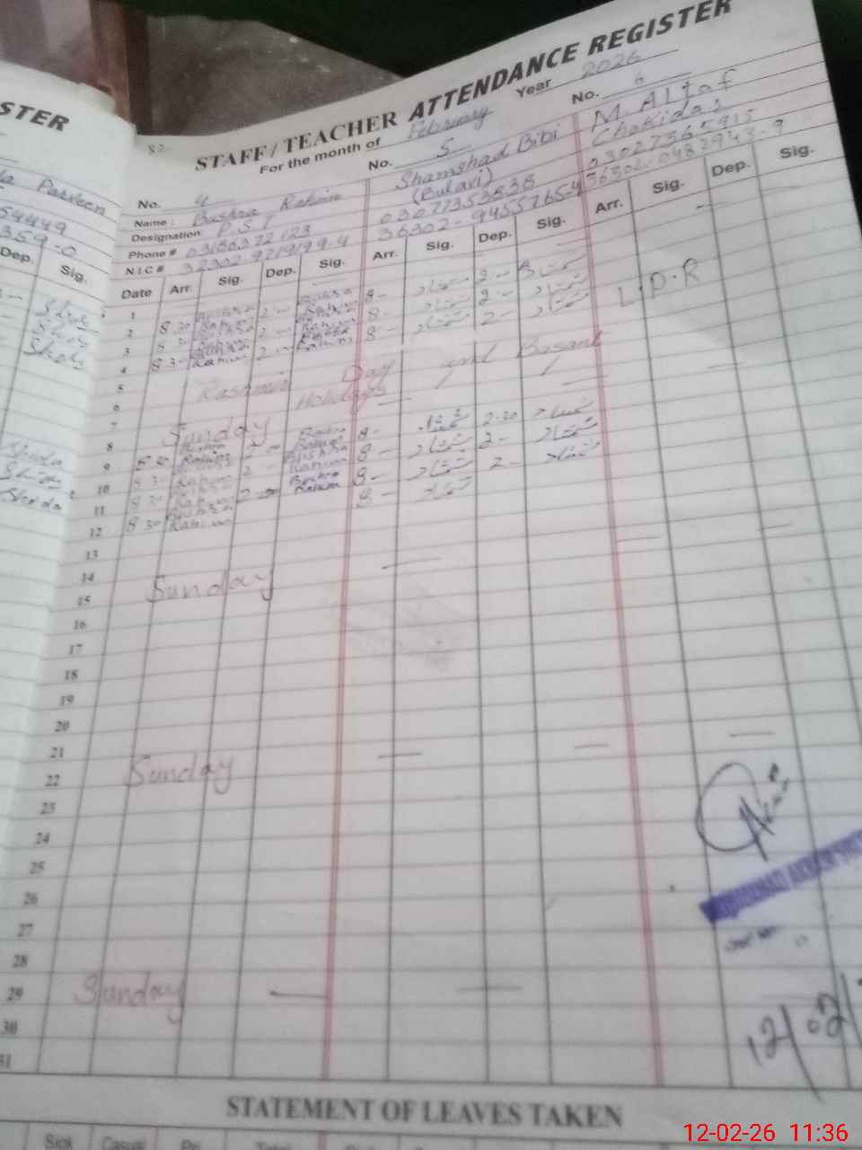 | CNIC | Full Name | Designation | R/C | Absence During Last Calender Month |