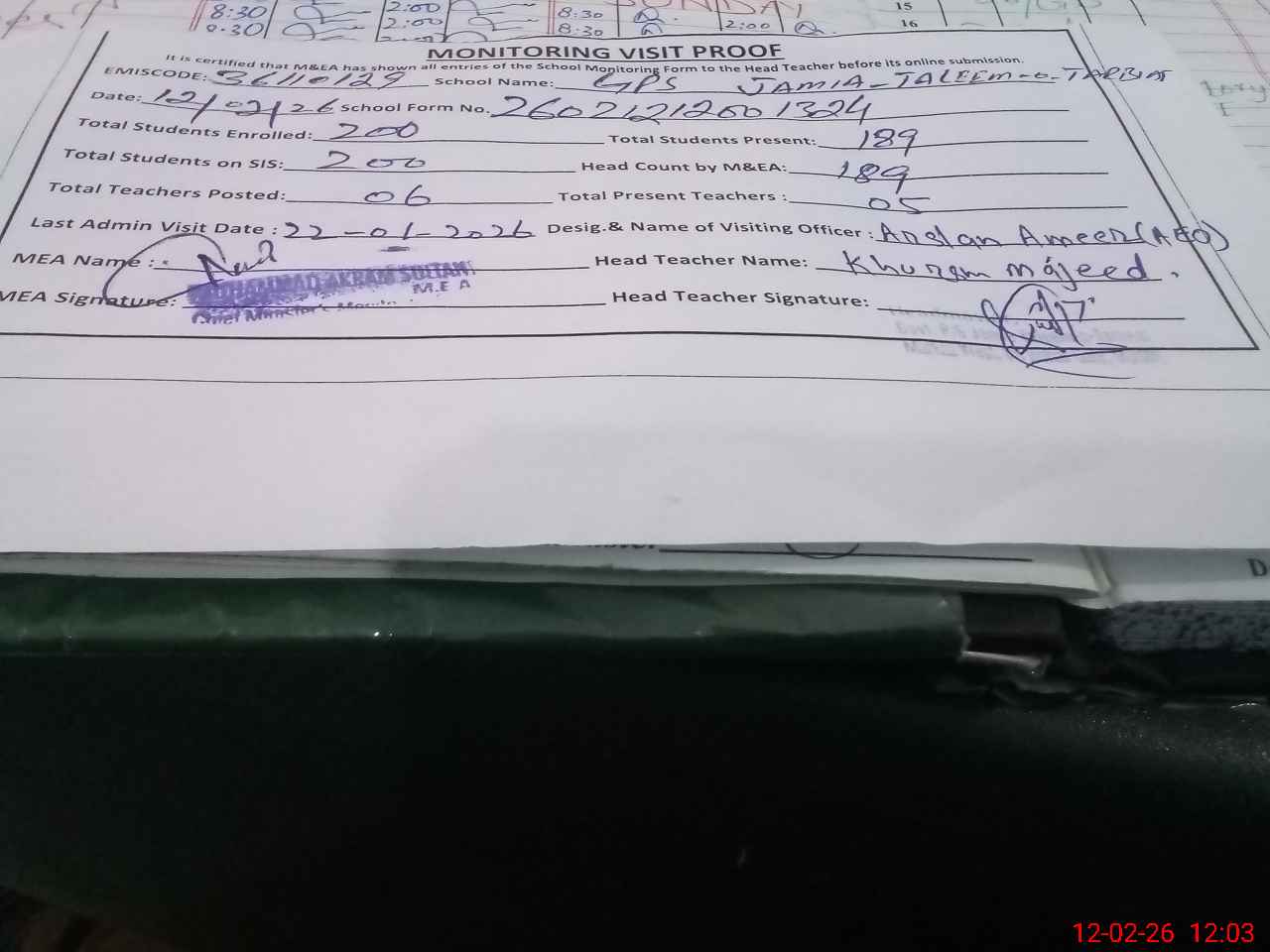 | Attendance Register | Head Teacher | MEA with School | Visit Proof |