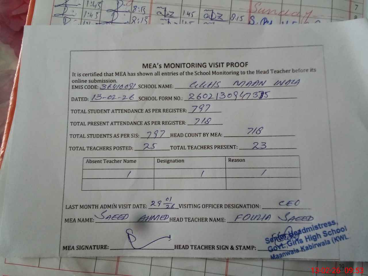 | Attendance Register | Head Teacher | MEA with School | Visit Proof |