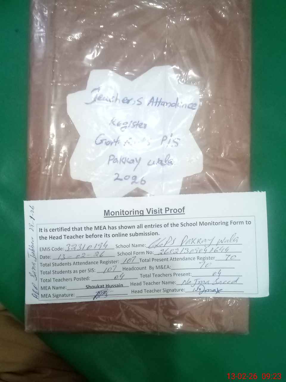 | Attendance Register | Head Teacher | MEA with School | Visit Proof |