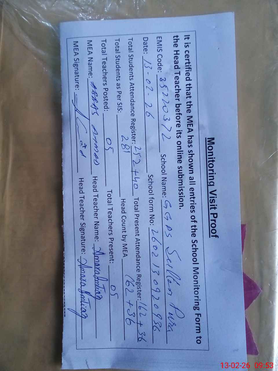 | Attendance Register | Head Teacher | MEA with School | Visit Proof |