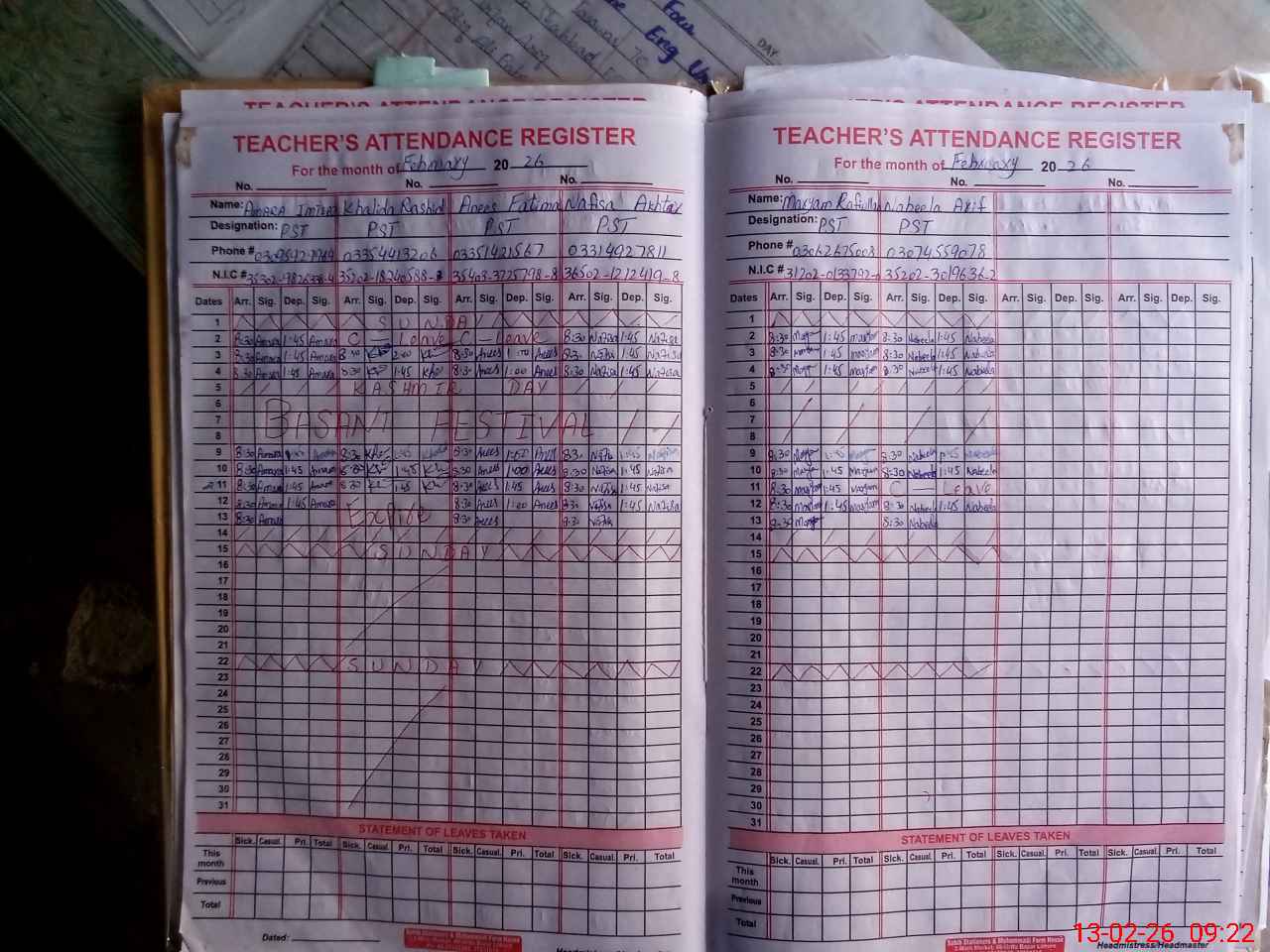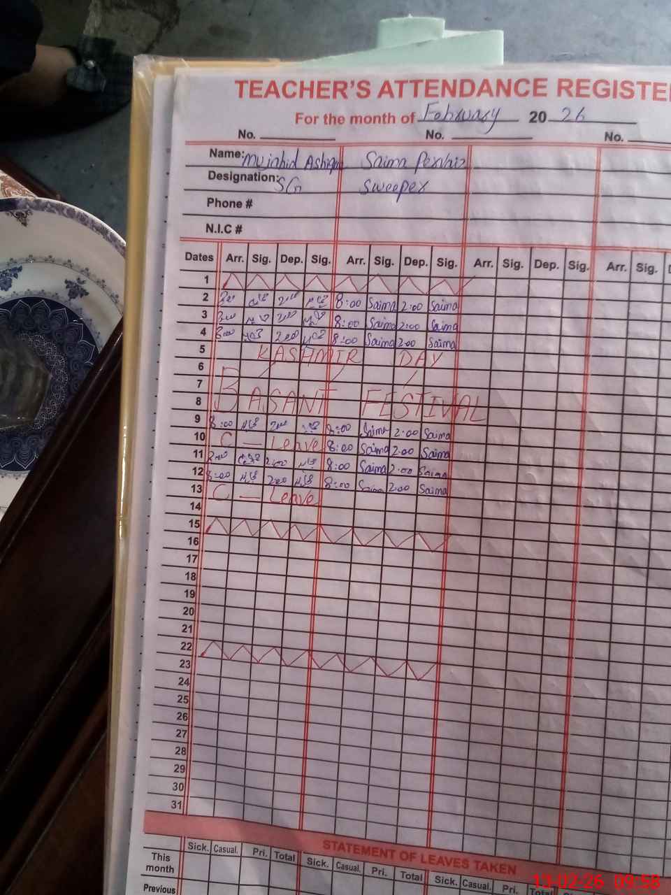 | CNIC | Full Name | Designation | R/C | Absence During Last Calender Month |