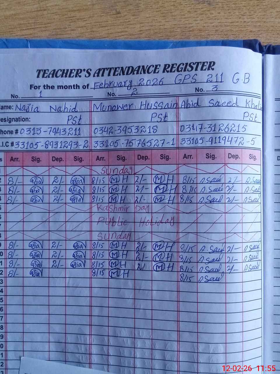 | CNIC | Full Name | Designation | R/C | Absence during last cal. month |