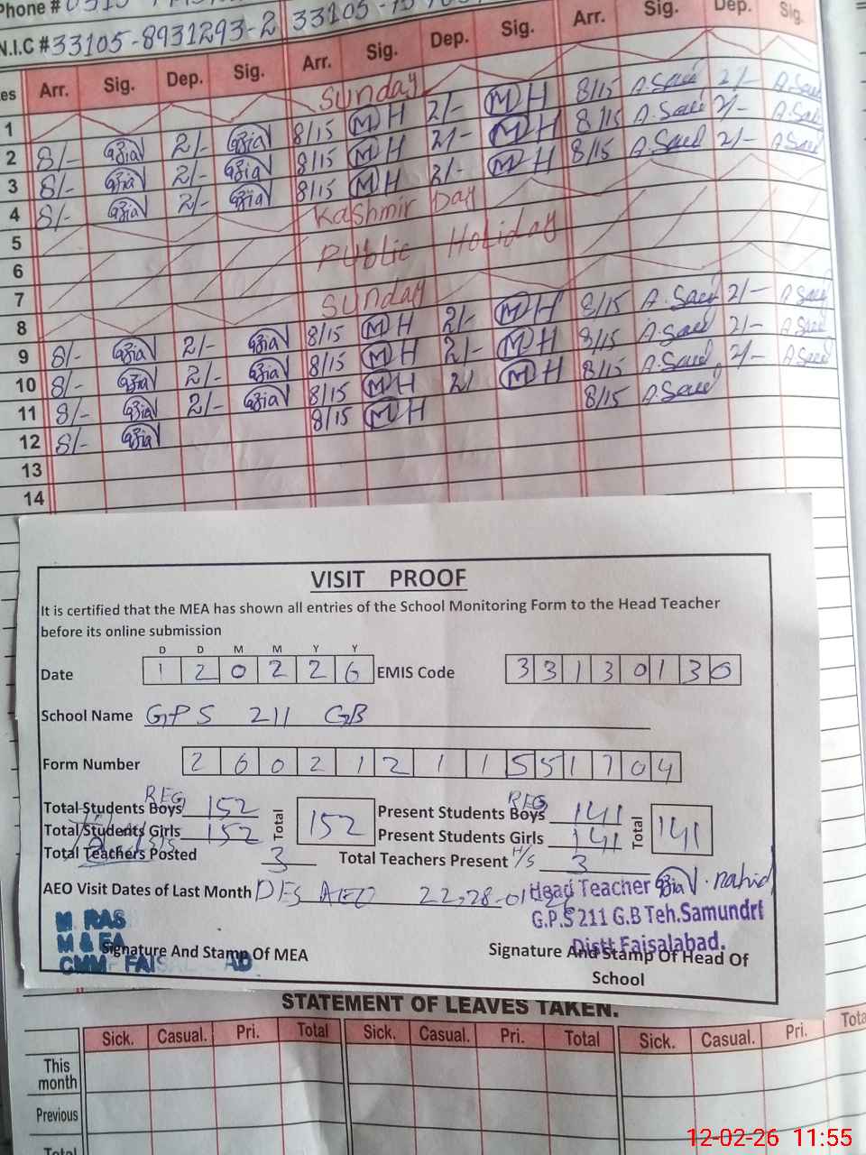 | Attendance Register | Head Teacher | MEA with School | Visit Proof |