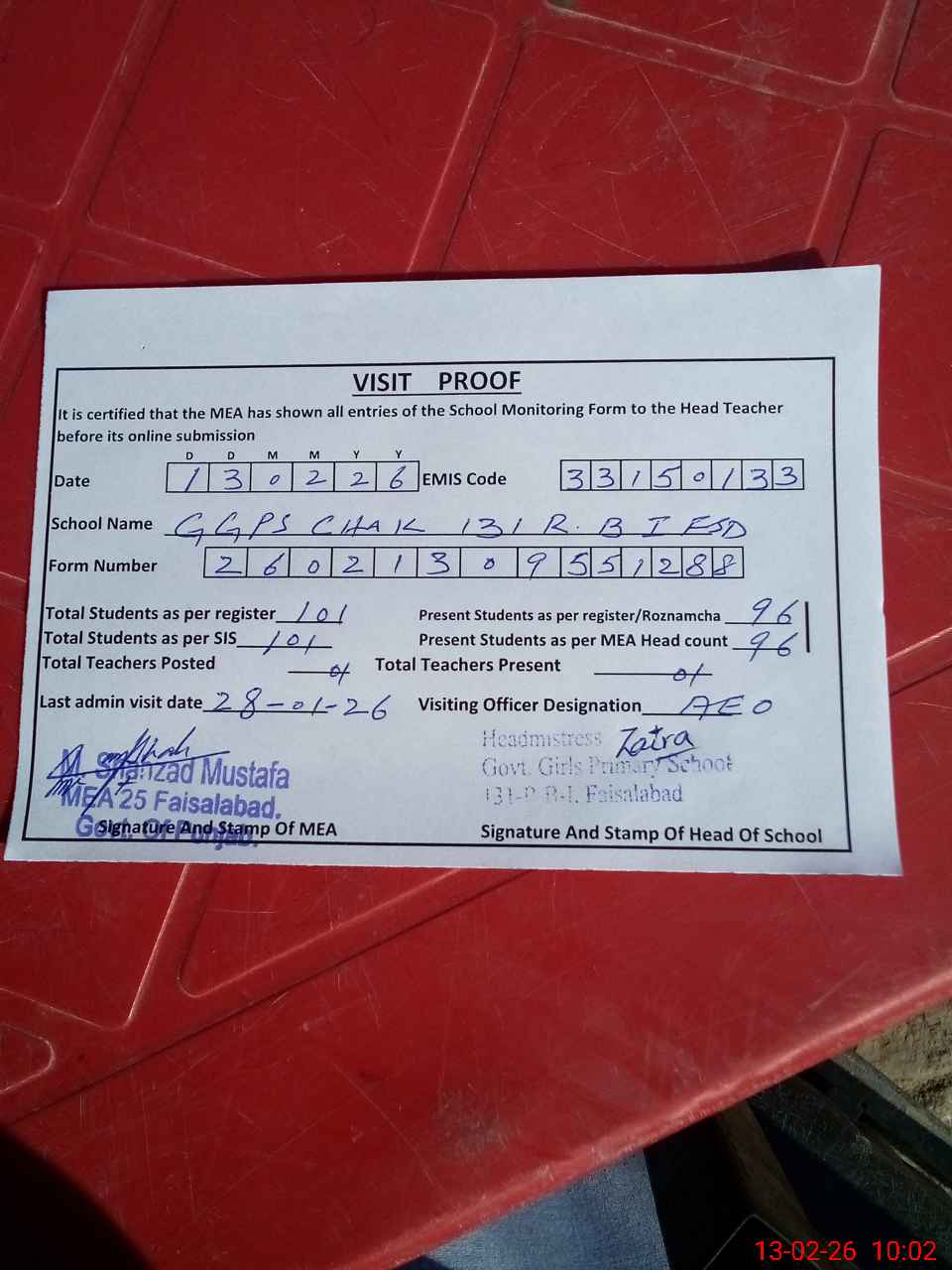| EMIS Code: 33150133 | Name of School: GGPS CHAK 131 RB 1 | |||