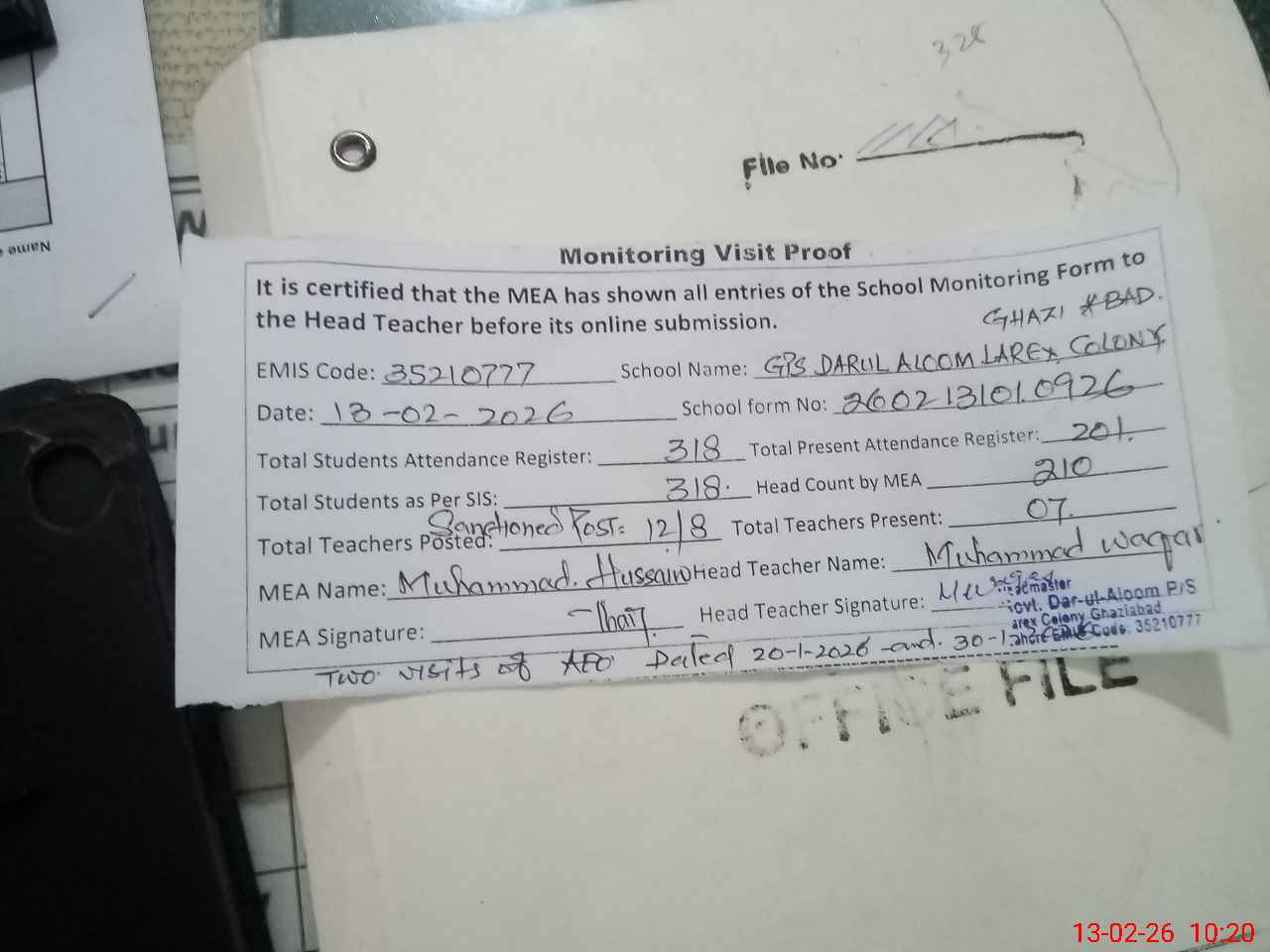 | Attendance Register | Head Teacher | MEA with School | Visit Proof |