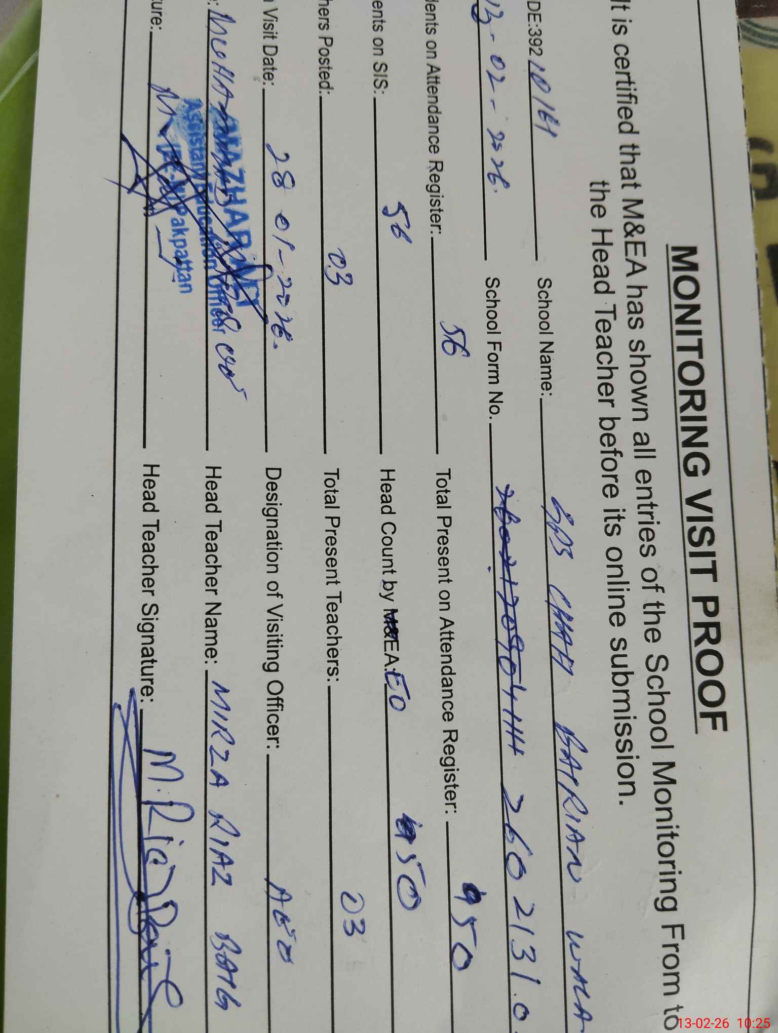 | Attendance Register | Head Teacher | MEA with School | Visit Proof |