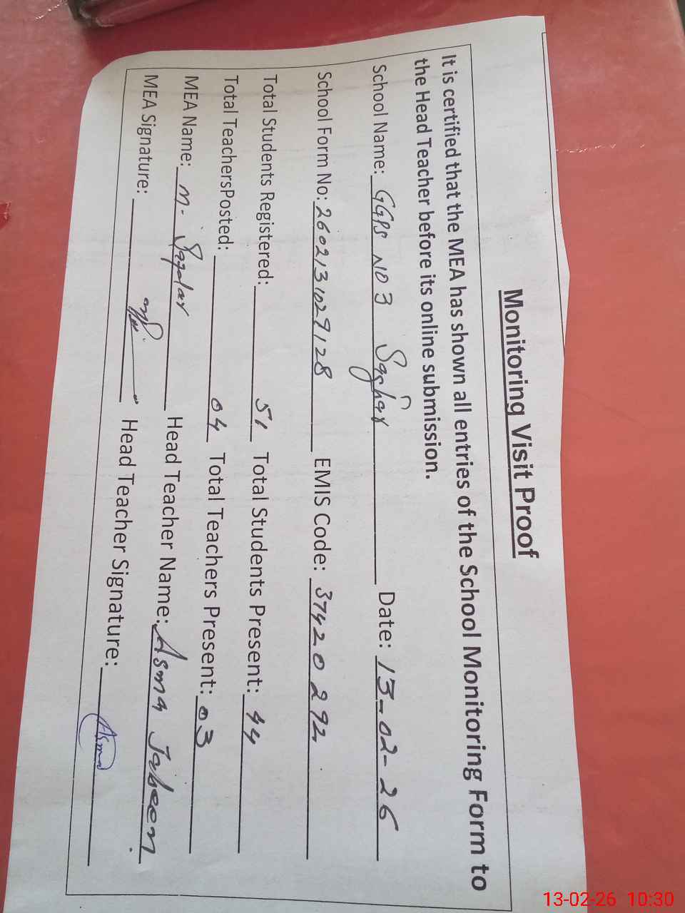 | Attendance Register | Head Teacher | MEA with School | Visit Proof |