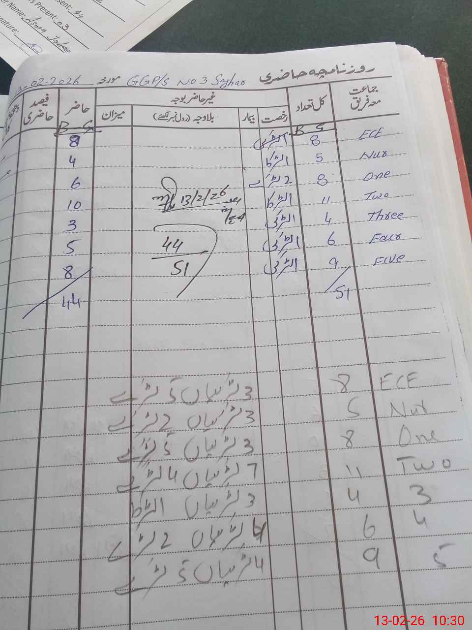 | Total Students Present | 0 | 8 | 6 | 10 | 3 | 5 | 8 | 44 | ||||||||