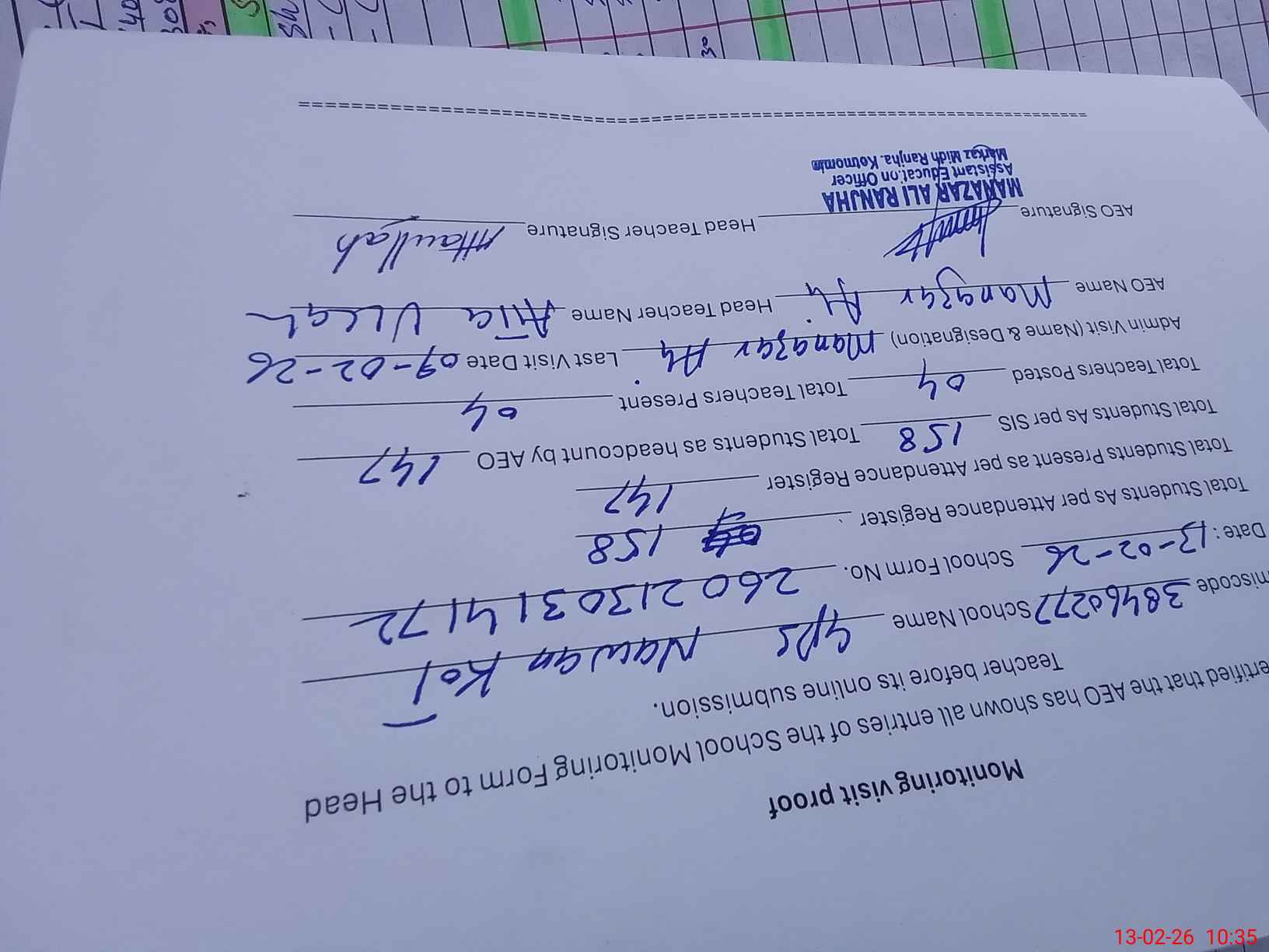 | Attendance Register | Head Teacher | MEA with School | Visit Proof |
