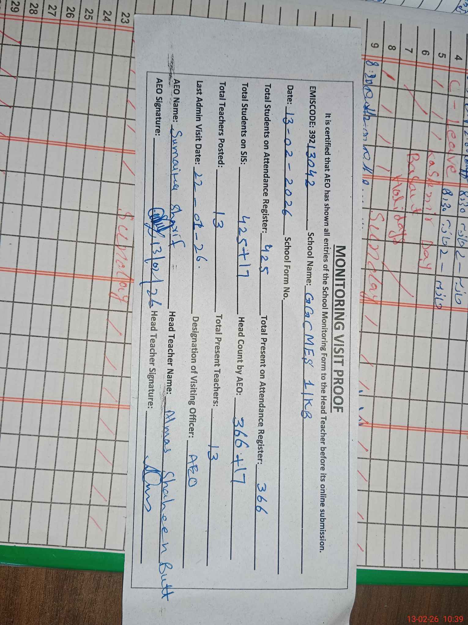 | Attendance Register | Head Teacher | MEA with School | Visit Proof |