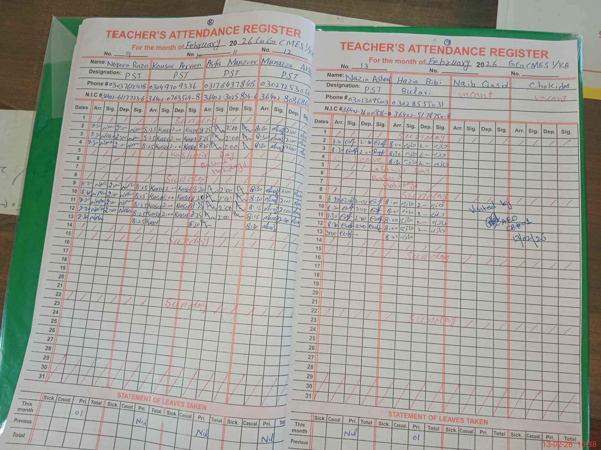 | CNIC | Full Name | Designation | R/C | Absence During Last Calender Month |