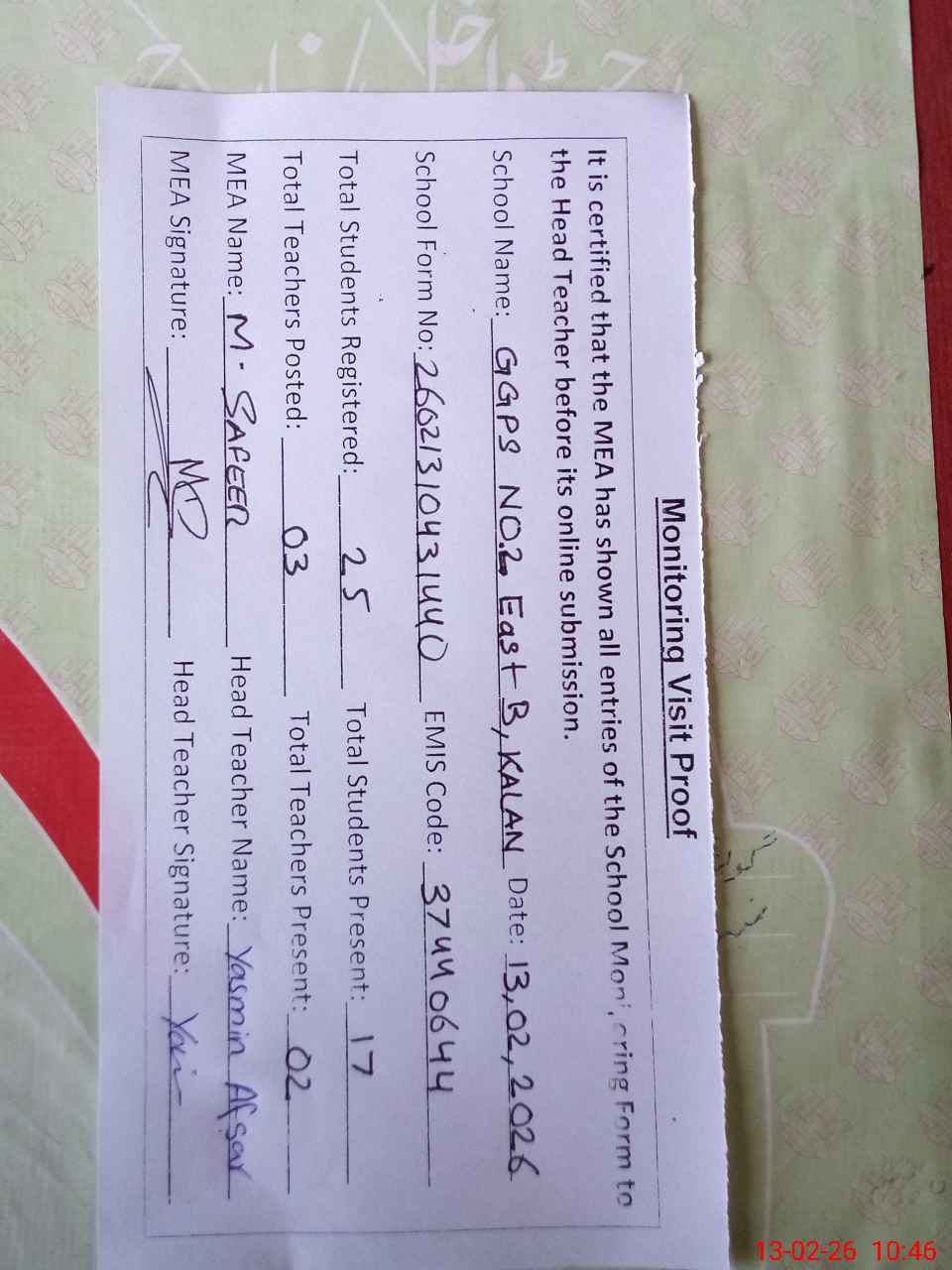 | Attendance Register | Head Teacher | MEA with School | Visit Proof |