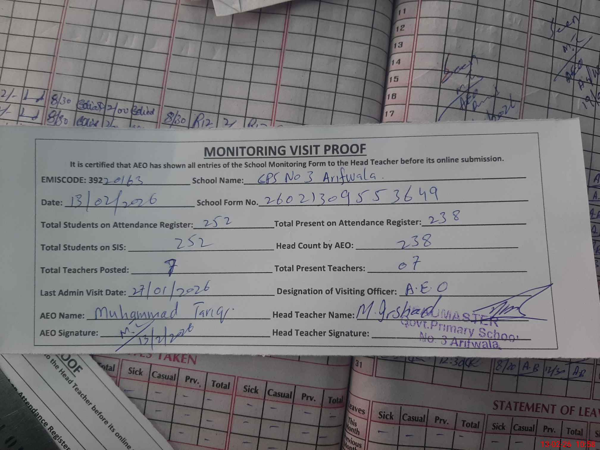 | EMIS Code: 39220163 | Name of School: GPS NO. 3 ARIFWALA | |||