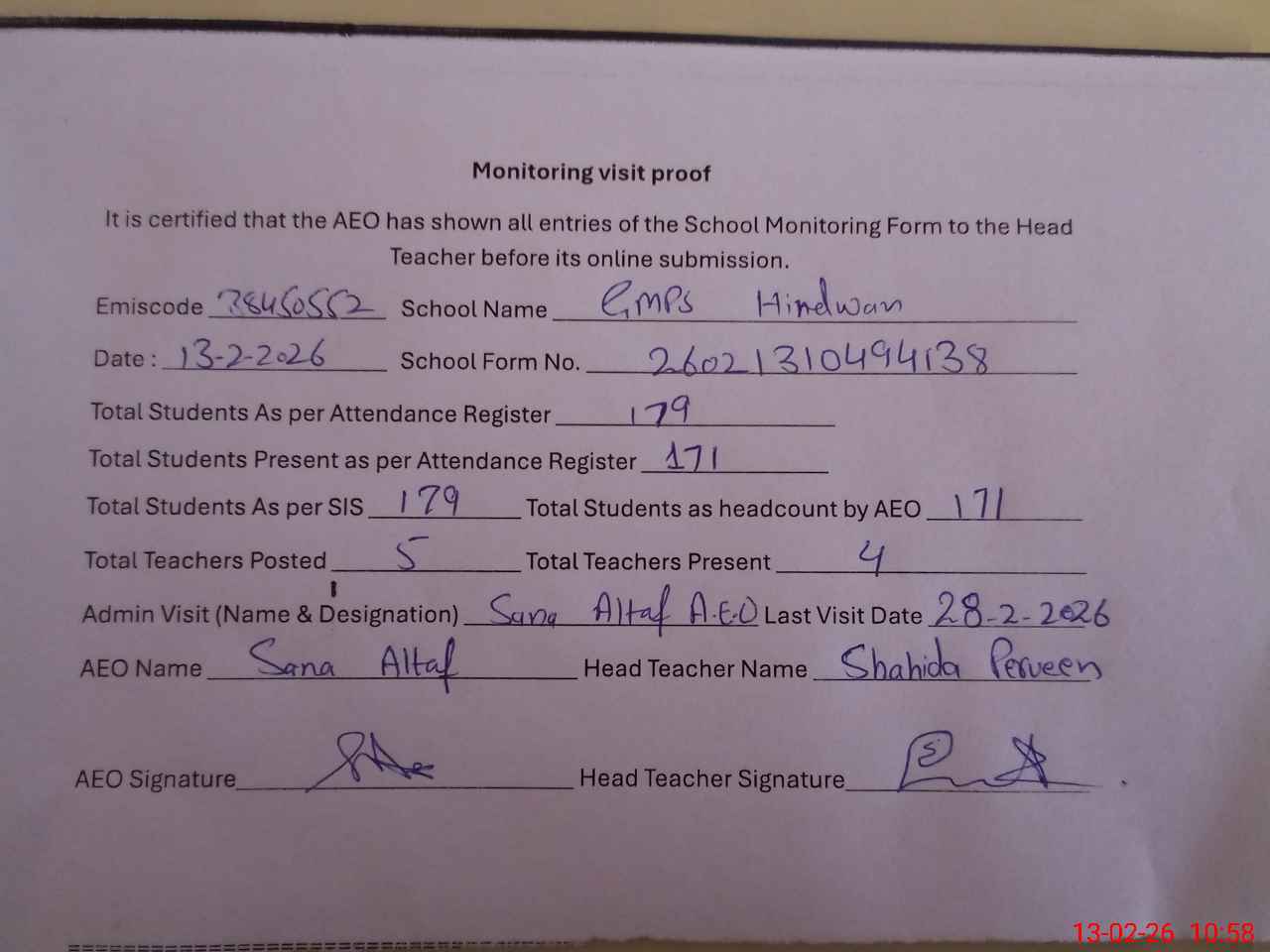 | Attendance Register | Head Teacher | MEA with School | Visit Proof |