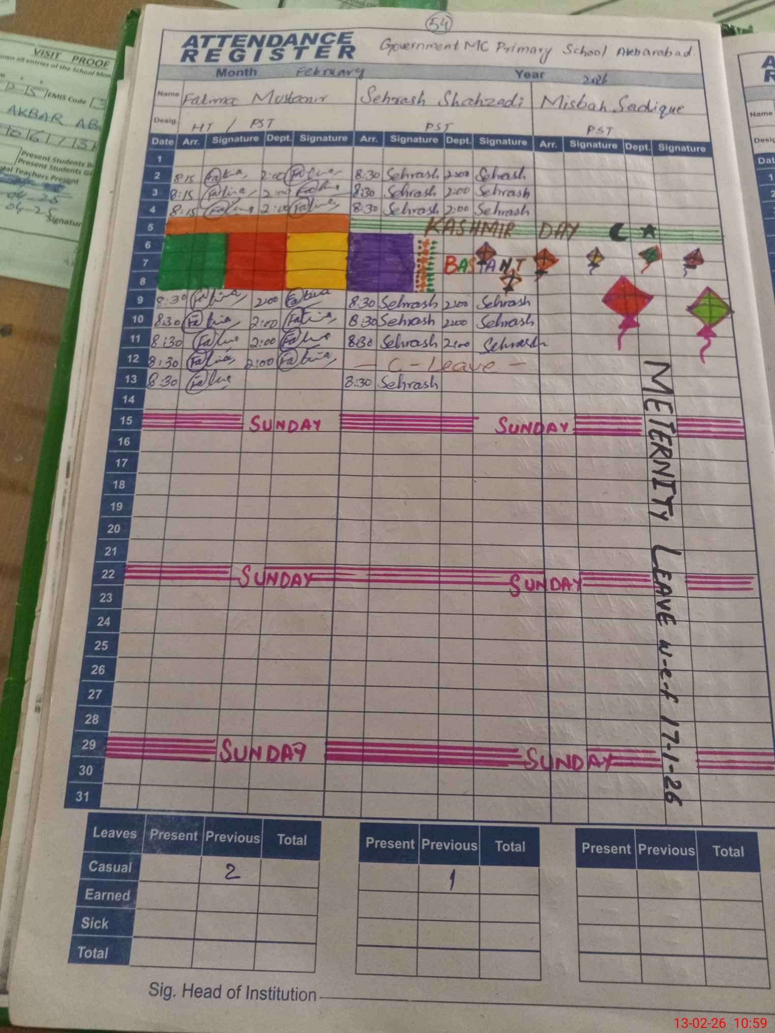 | Leave | Duty | Absent | Maternity | Medical | Ex- Pak |