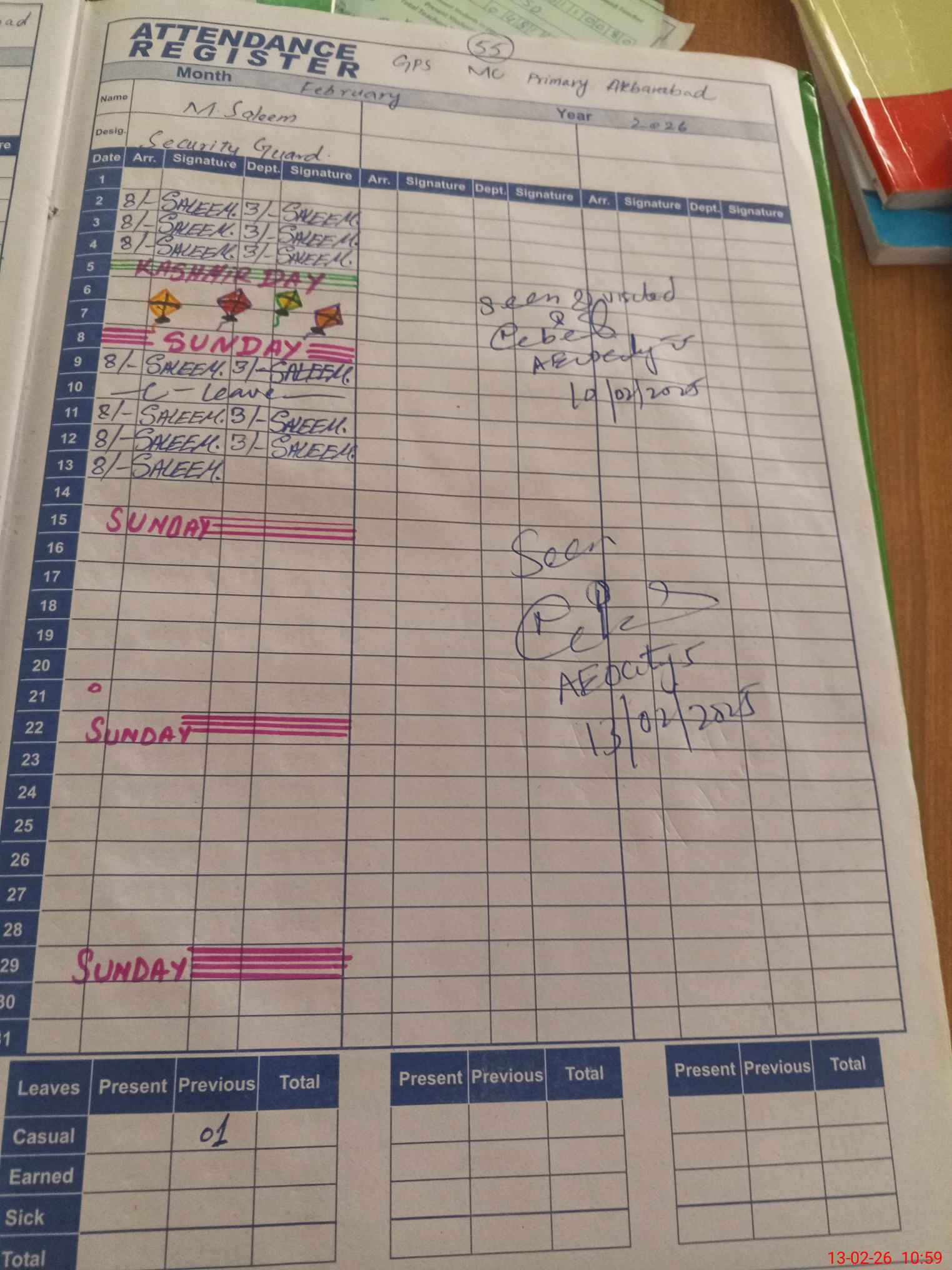 | CNIC | Full Name | Designation | R/C | Absence During Last Calender Month |