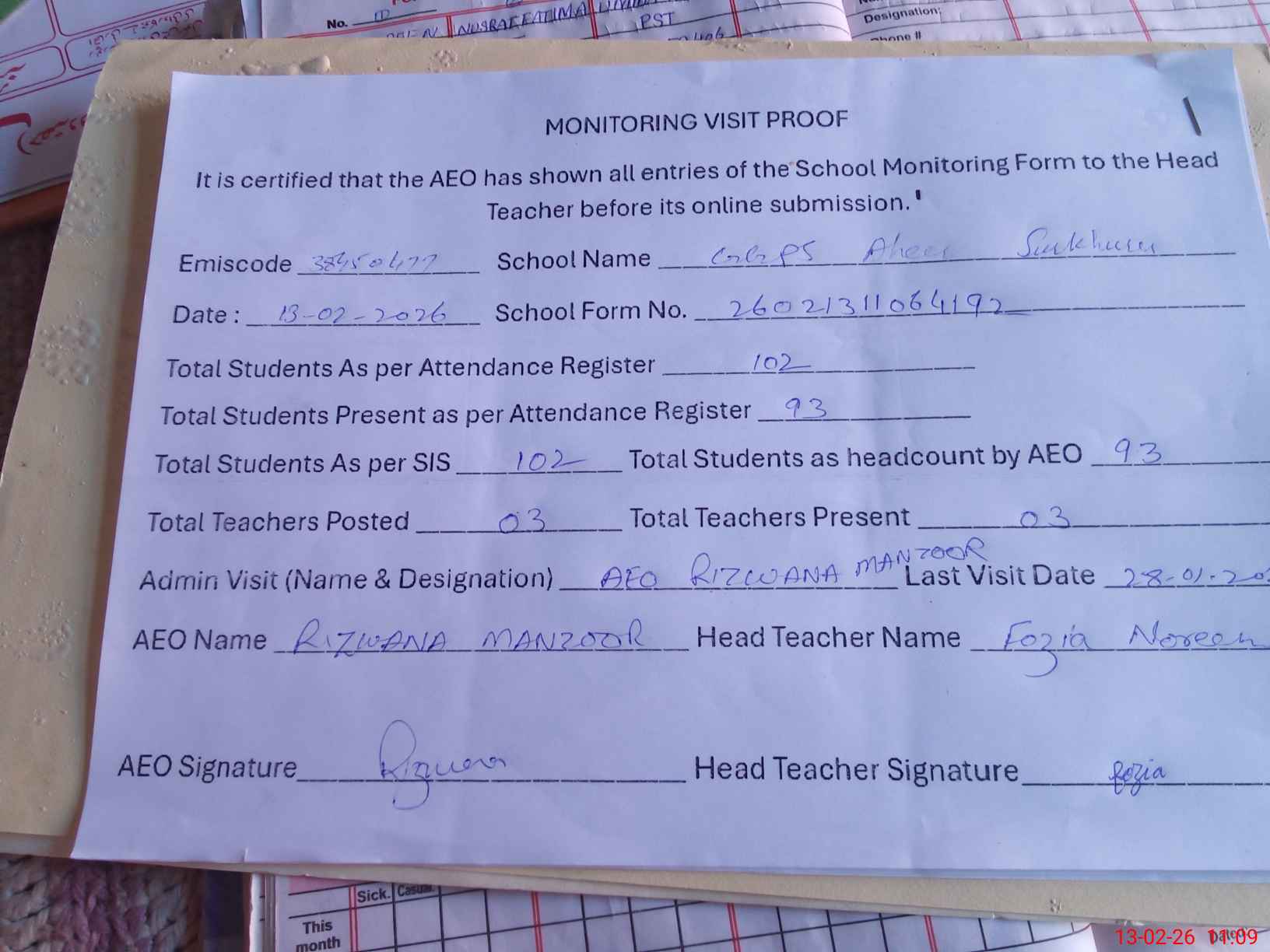 | Attendance Register | Head Teacher | MEA with School | Visit Proof |