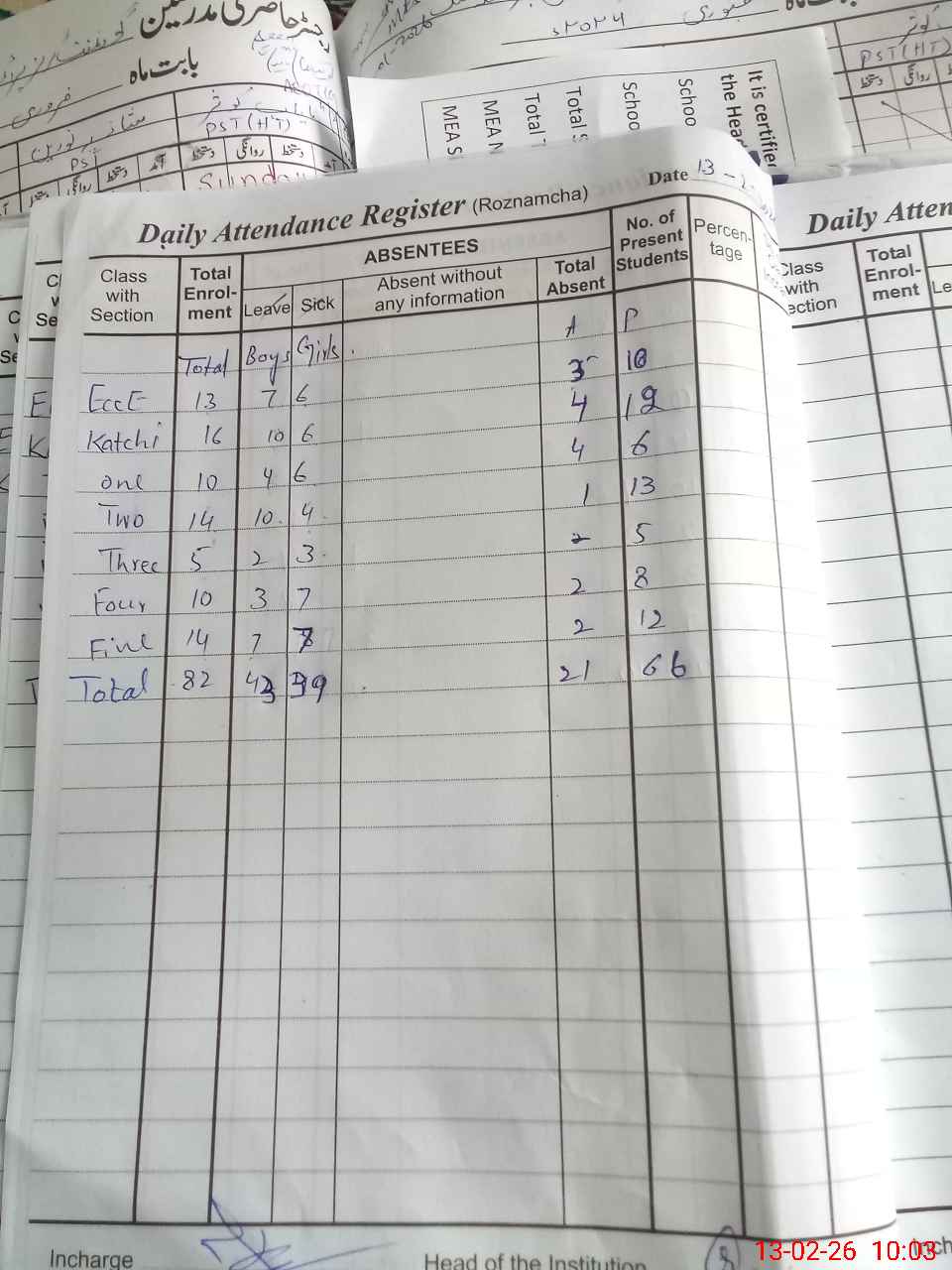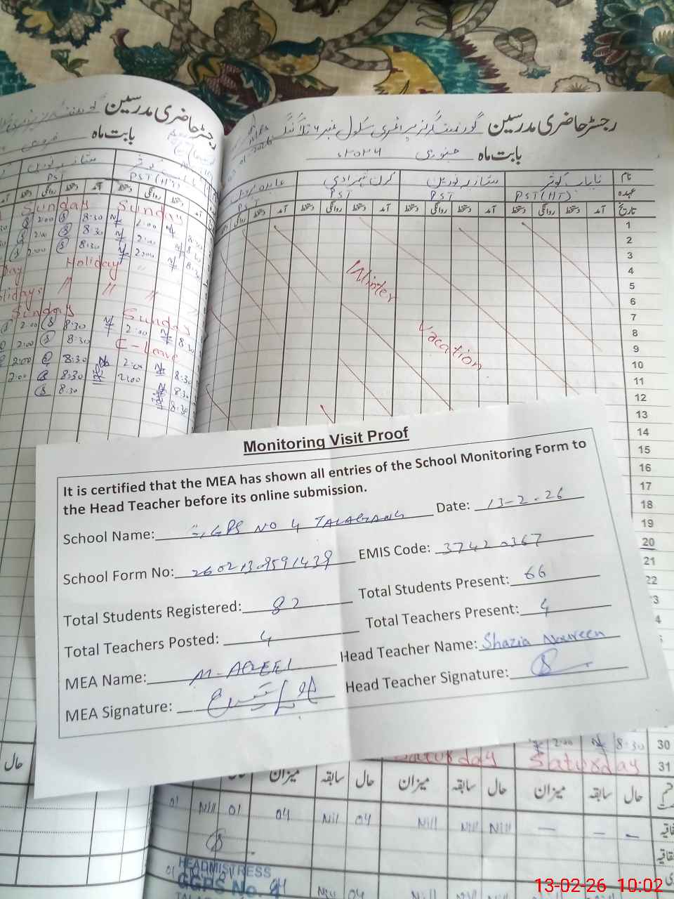 | Attendance Register | Head Teacher | MEA with School | Visit Proof |