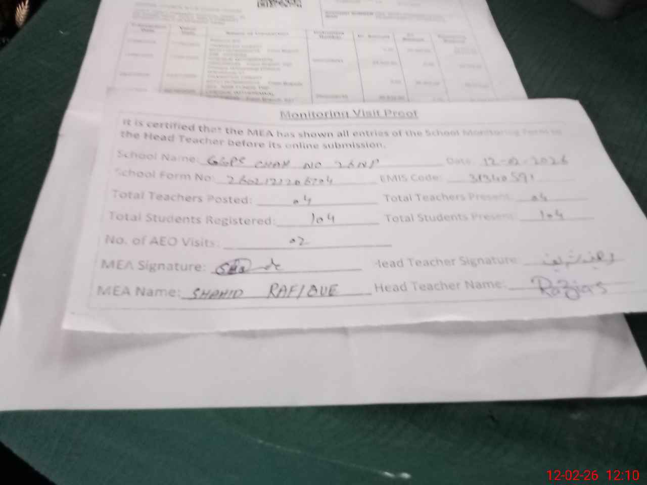 | Attendance Register | Head Teacher | MEA with School | Visit Proof |