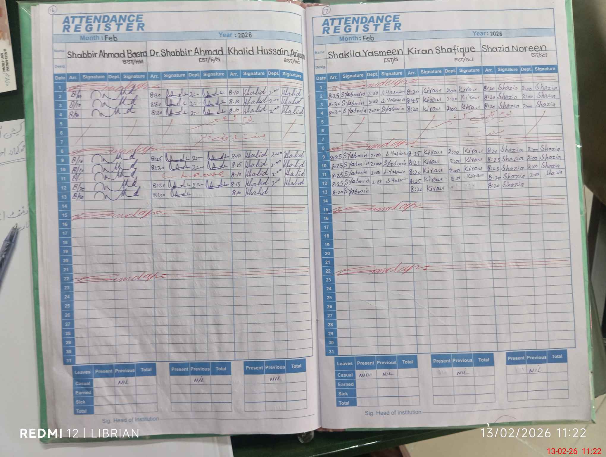 | CNIC | Full Name | Designation | R/C | Absence During Last Calender Month |
