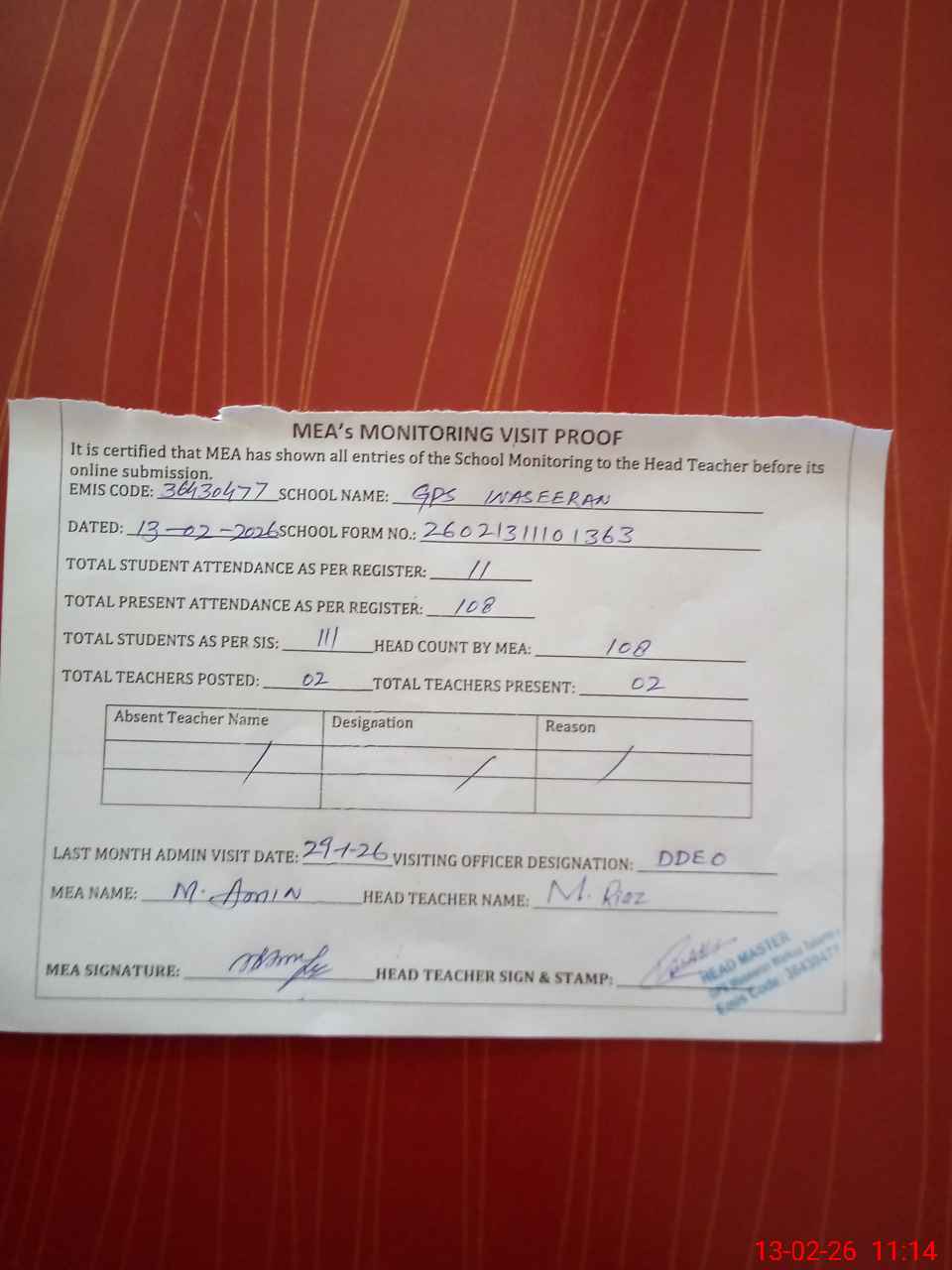 | EMIS Code: 36430477 | Name of School: GPS WASEERAN P/O TULAMBA | |||