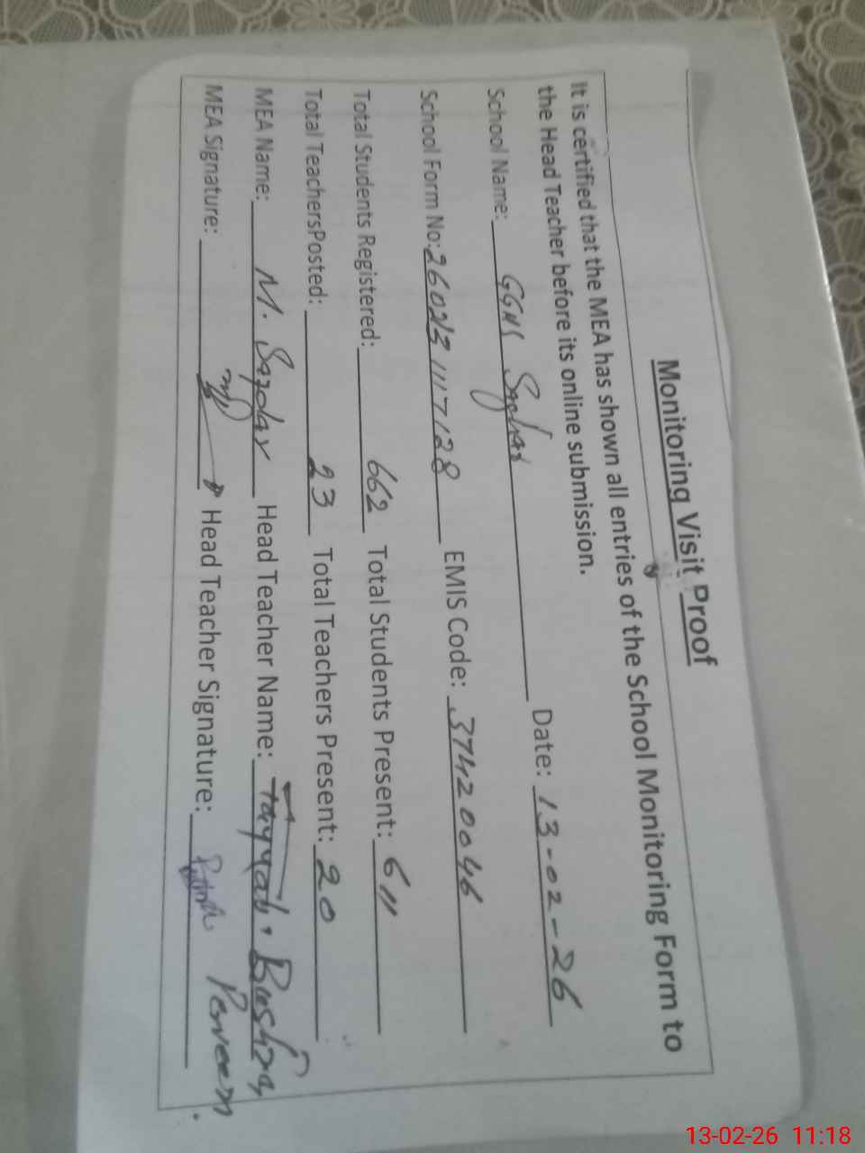 | EMIS Code: 37420046 | Name of School: GGHS SAGHAR | |||