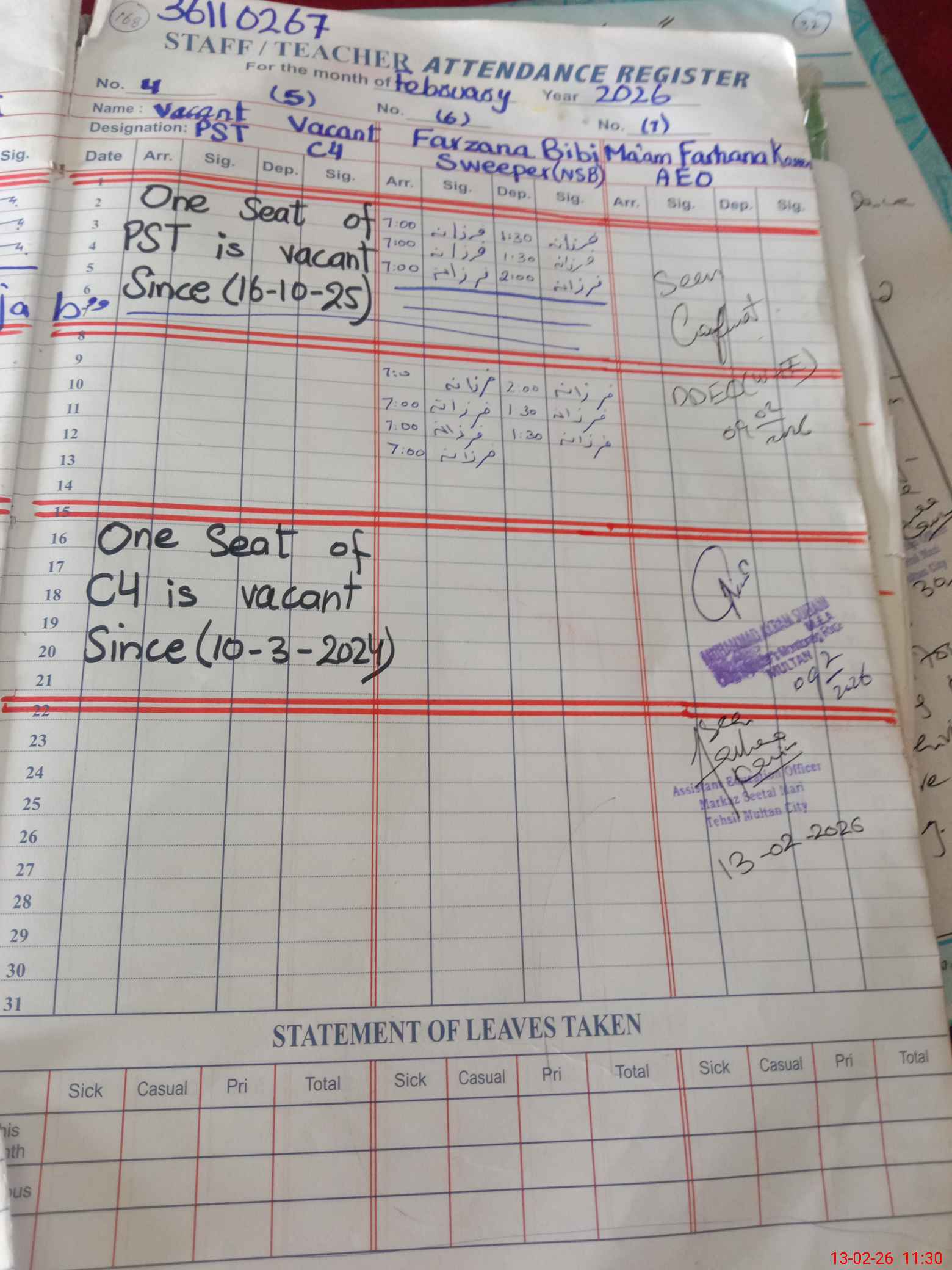 | CNIC | Full Name | Designation | R/C | Absence During Last Calender Month |