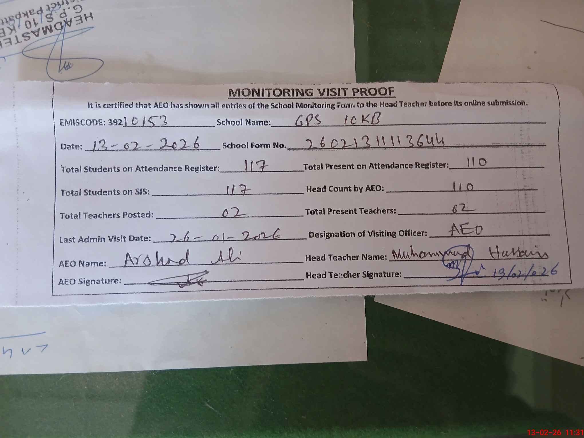 | Attendance Register | Head Teacher | MEA with School | Visit Proof |