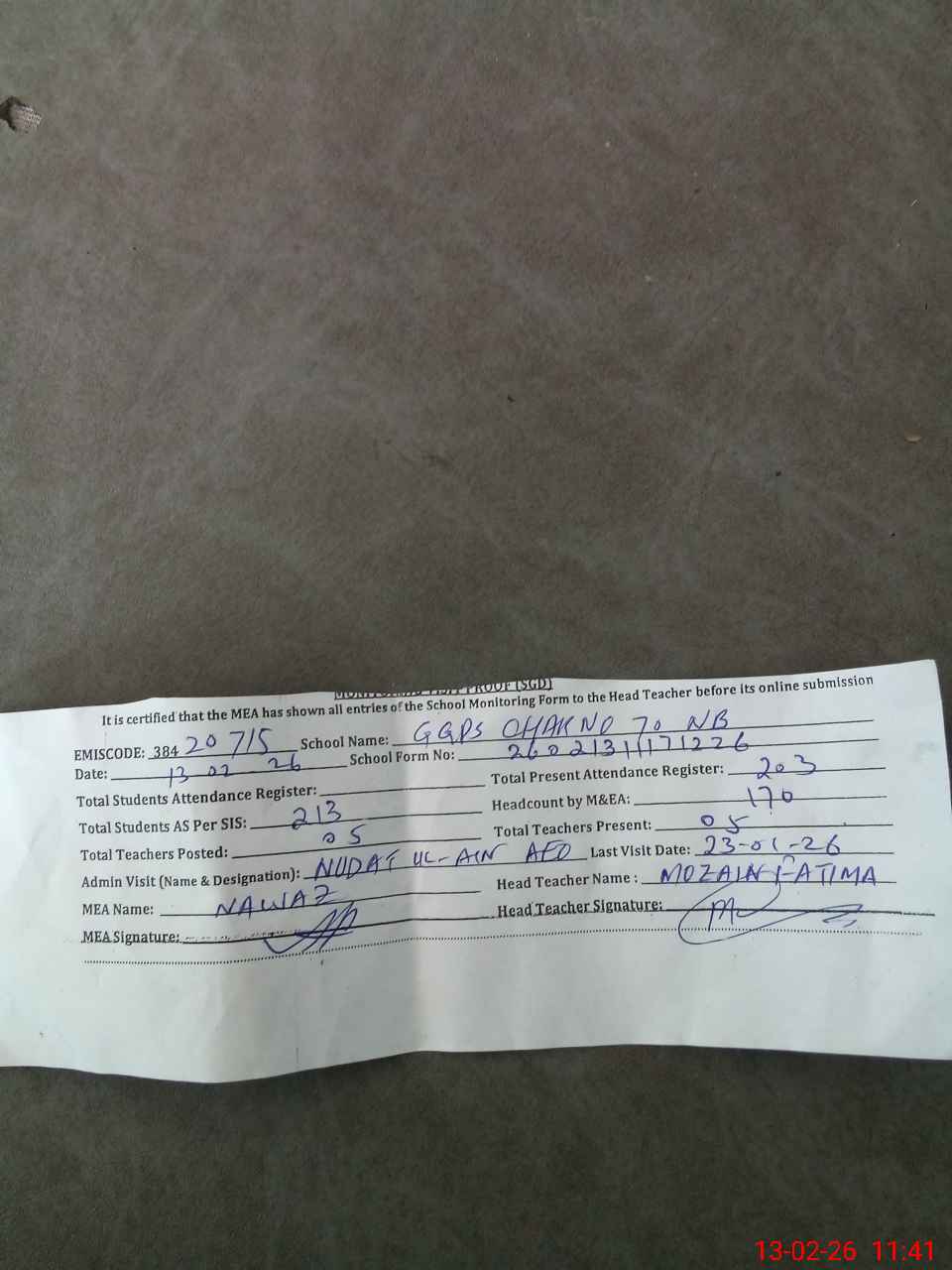 | Attendance Register | Head Teacher | MEA with School | Visit Proof |