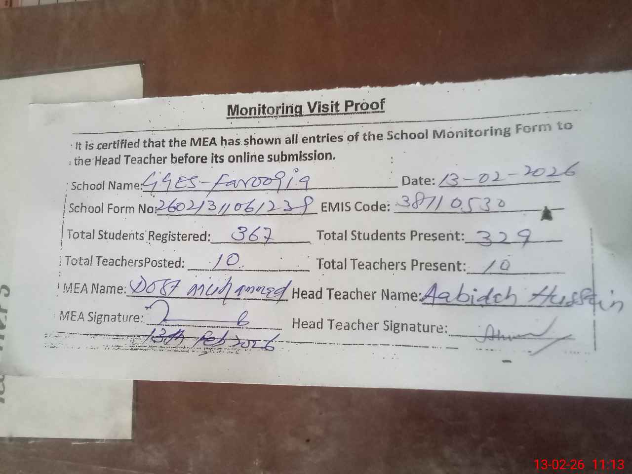 | Attendance Register | Head Teacher | MEA with School | Visit Proof |