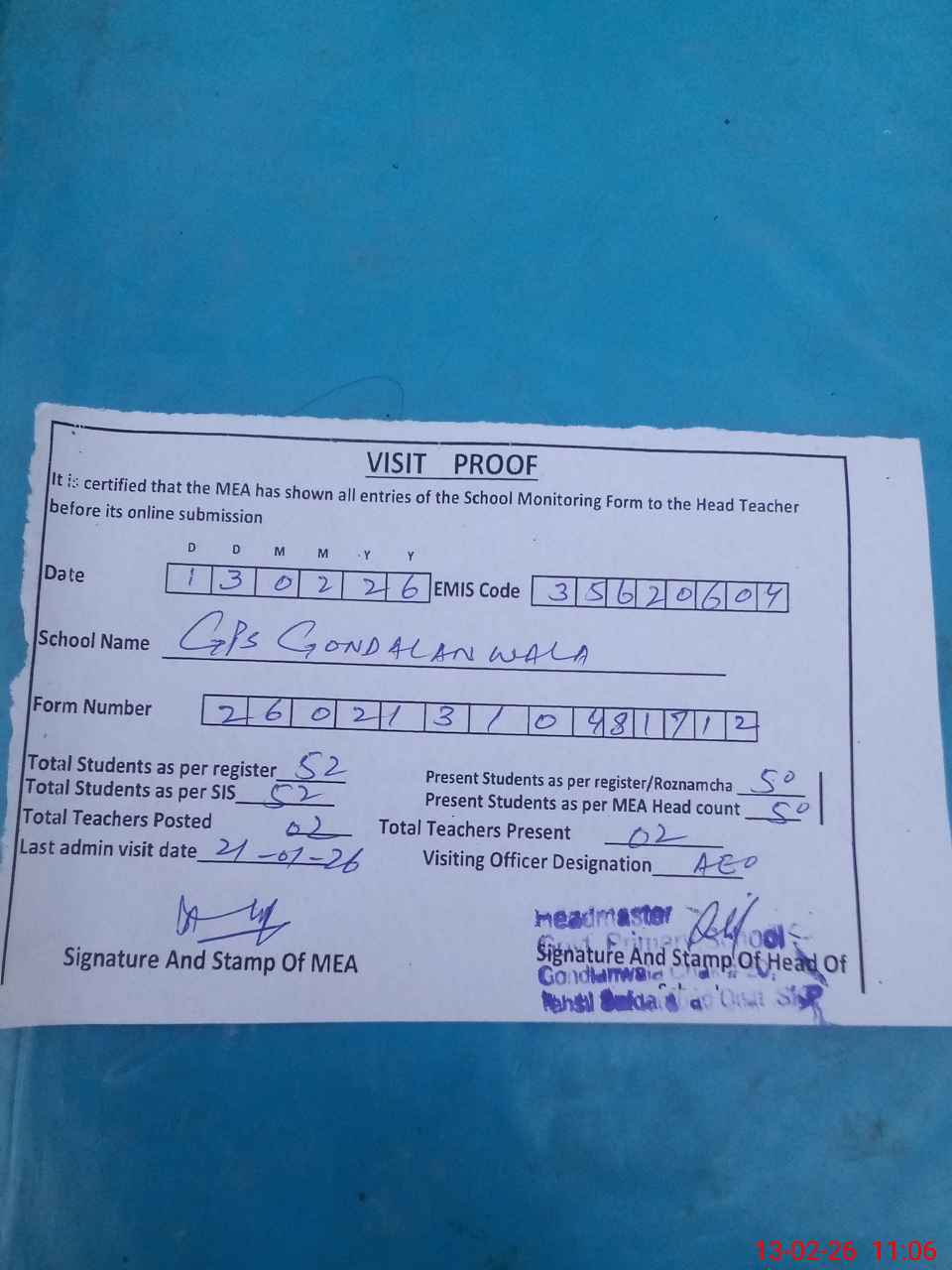 | EMIS Code: 35620604 | Name of School: GPS GONDLAWALA CHAK 20 RB | |||