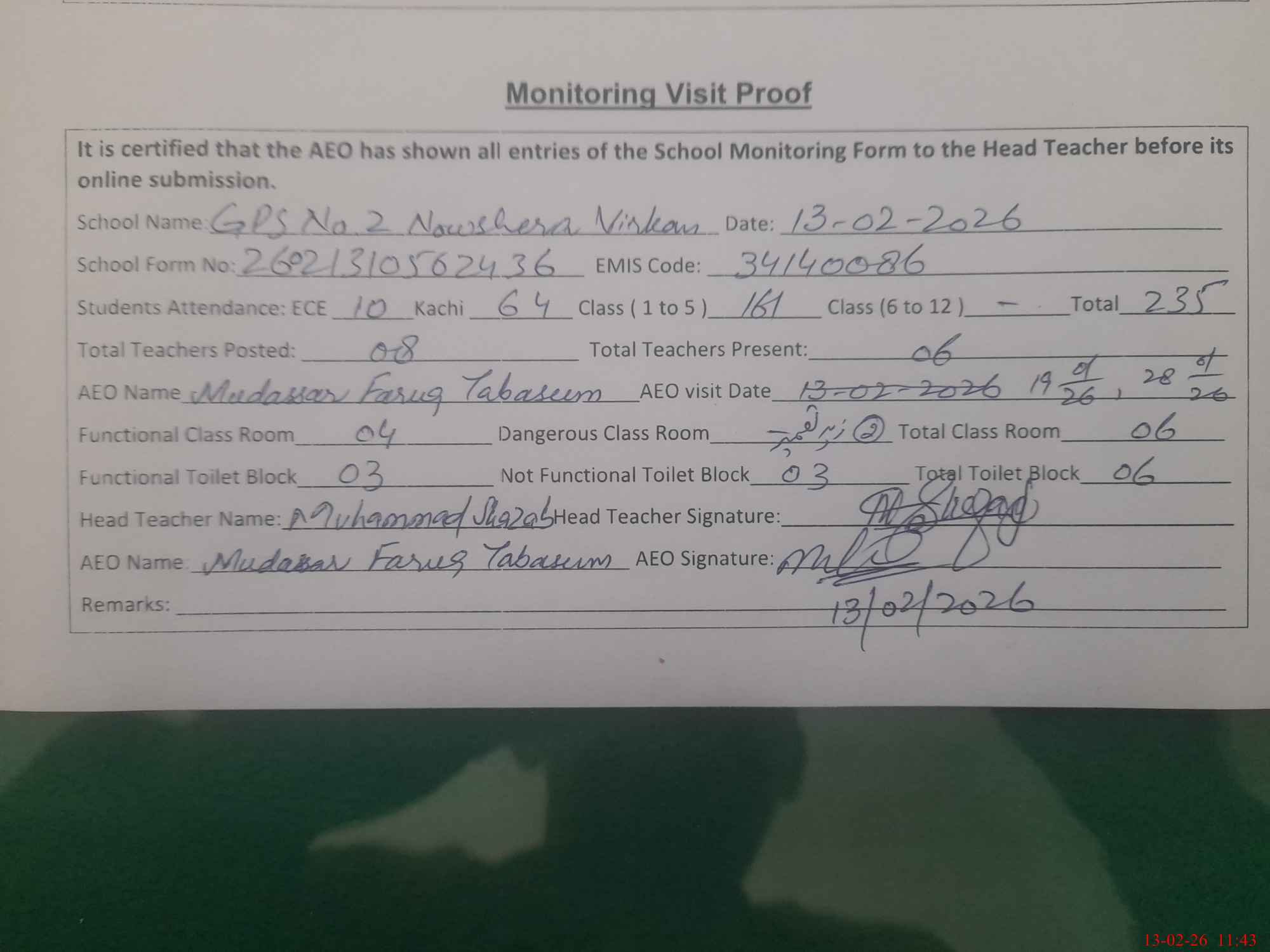 | Certified that this School was Inspected by the Undersigned MEA/DMO Today and the Information Stated Above is as Per Record. | |||||