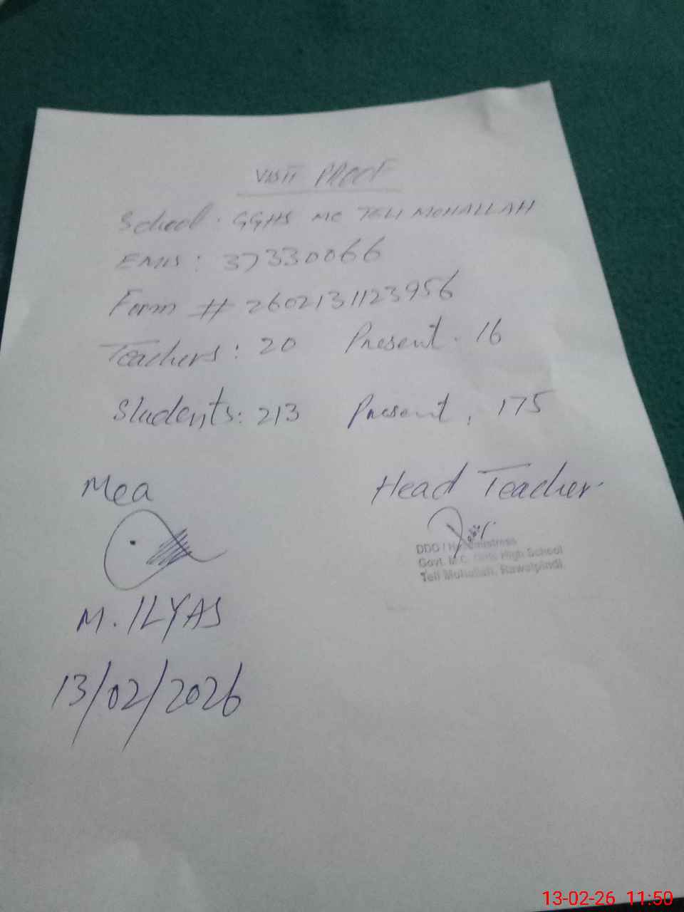 | Attendance Register | Head Teacher | MEA with School | Visit Proof |