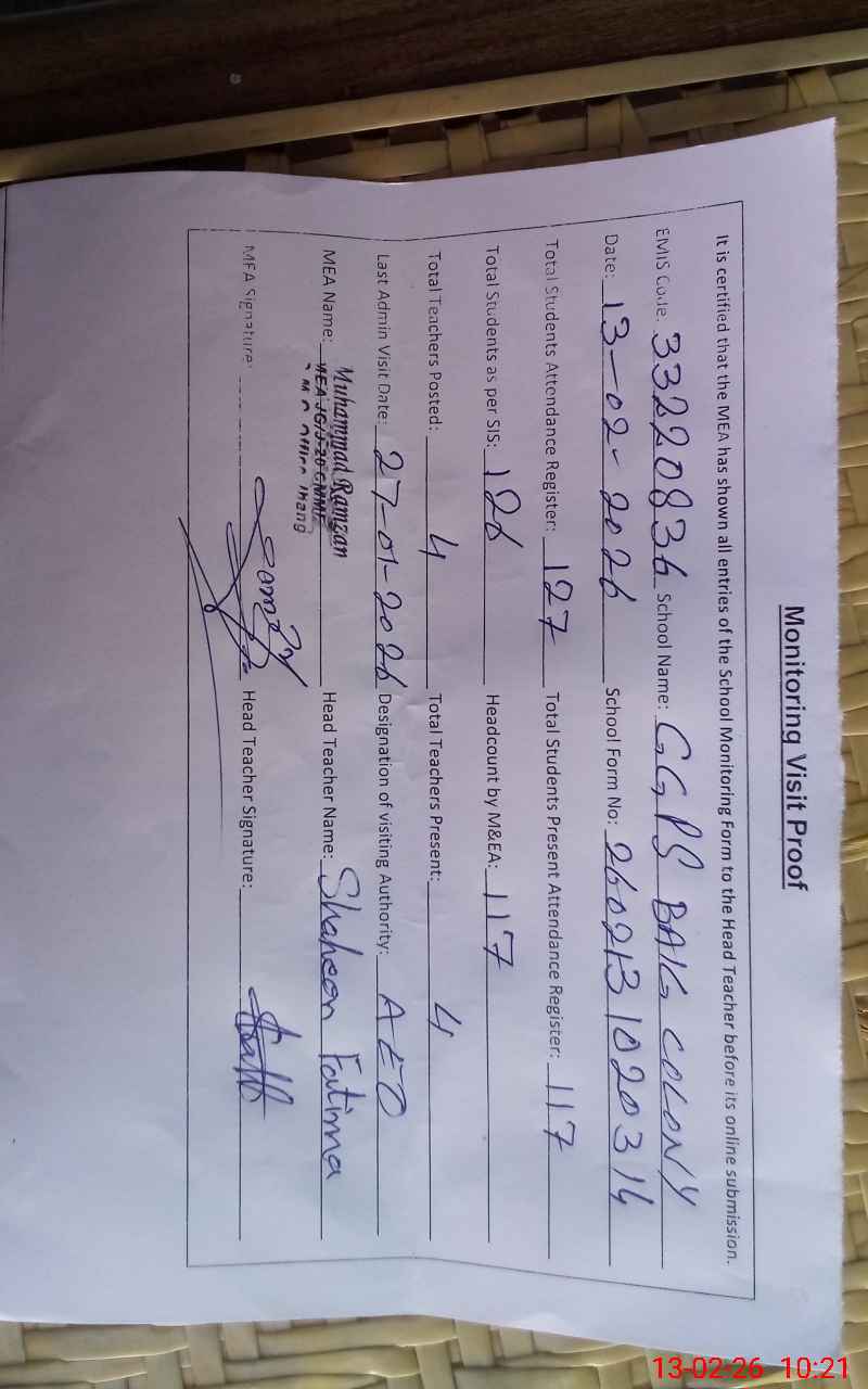 | EMIS Code: 33220836 | Name of School: GGPS BAIG COLONY | |||
