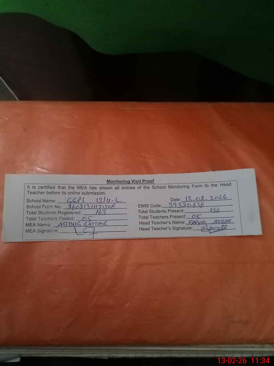 | Attendance Register | Head Teacher | MEA with School | Visit Proof |