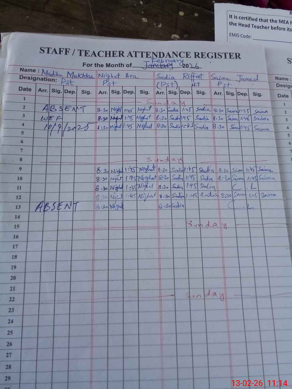 | Remarks (Use Separate Page if Required): 1 Madiha Mukhtar PST is absent from duty wef 11 Sep 2025 to till date | |||||