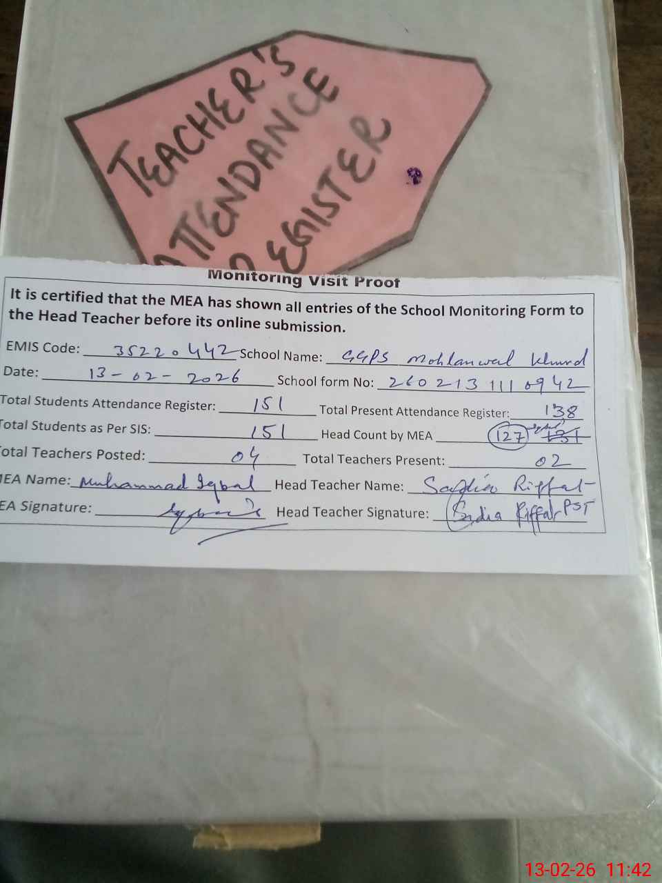 | Attendance Register | Head Teacher | MEA with School | Visit Proof |