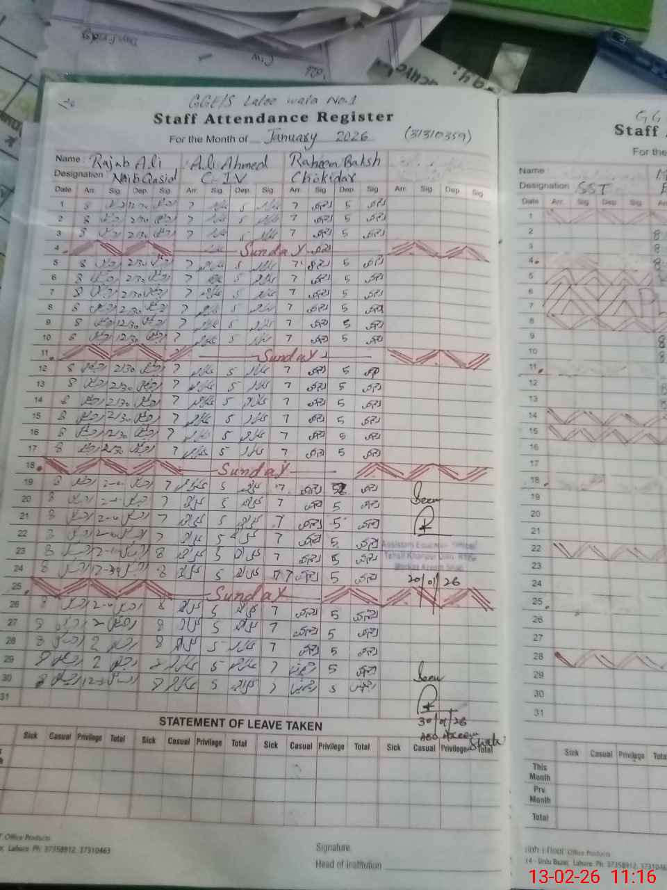 | CNIC | Full Name | Designation | R/C | Absence During Last Calender Month |